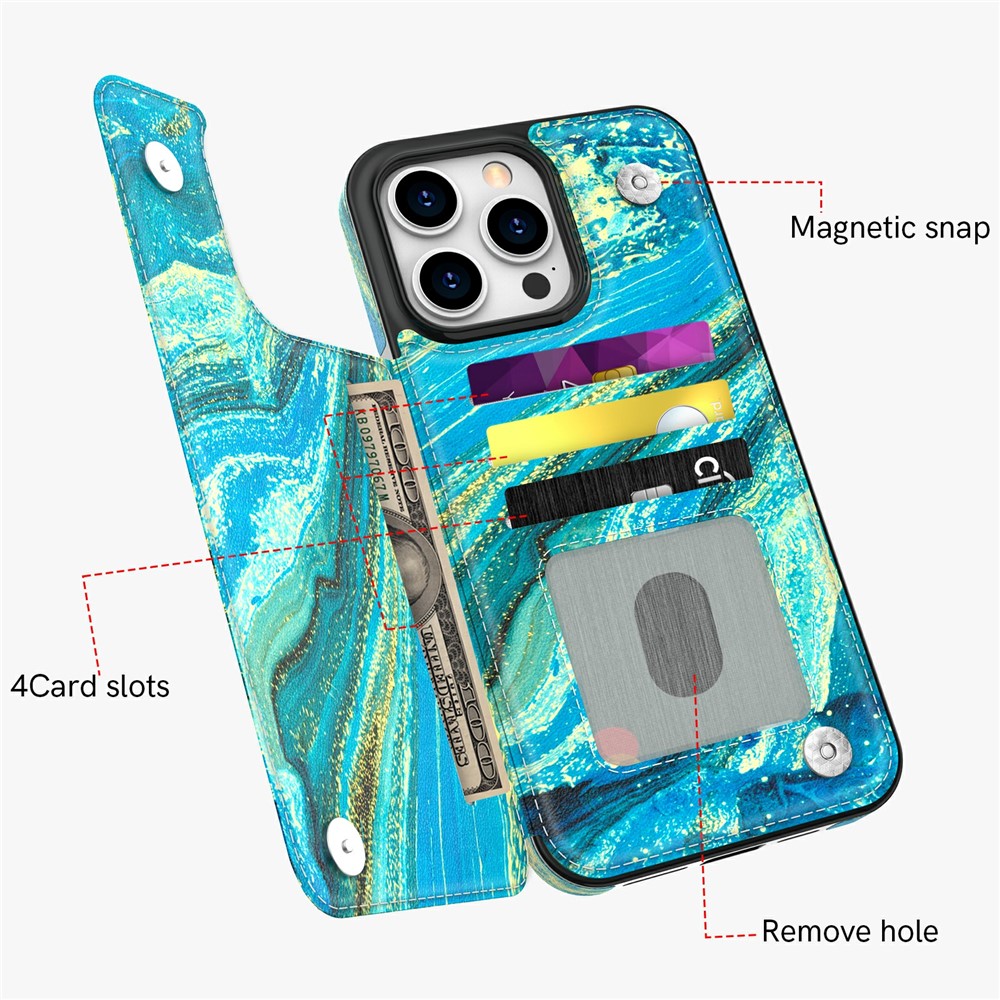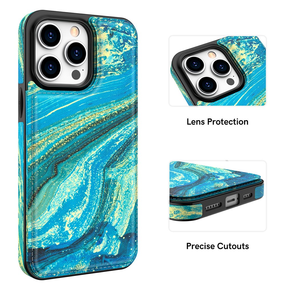 AHASTYLE WG08 For iPhone 14 Pro Max Case Pattern Printing Wallet Kickstand Anti Drop Leather Phone Back Cover - Blue Green $18.70