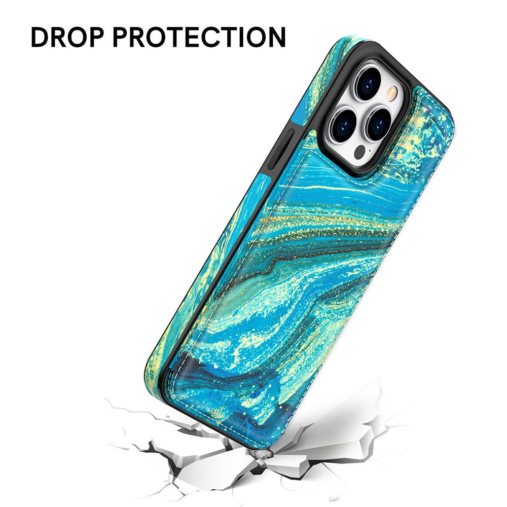 • AHASTYLE WG08 For iPhone 14 Pro Max Case Pattern Printing Wallet Kickstand Anti Drop Leather Phone Back Cover - Marble Green