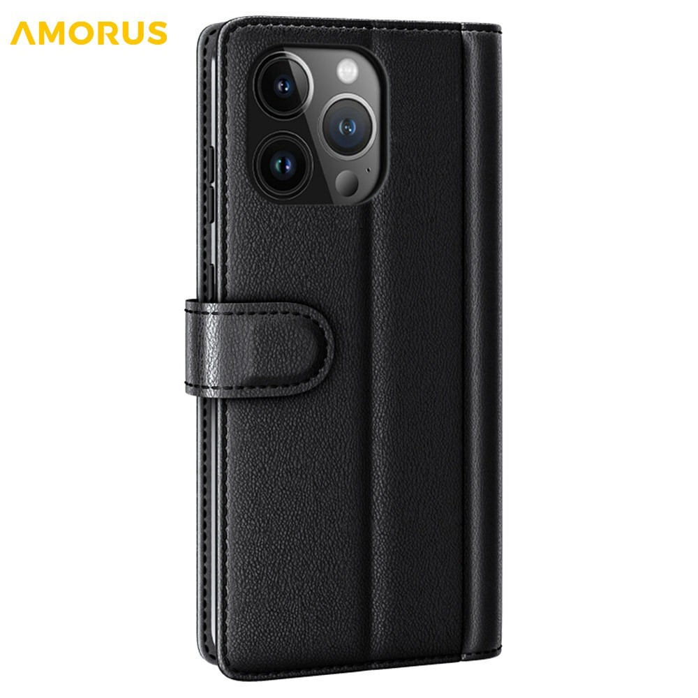 AMORUS For iPhone 13 Pro Max Stand Cases Calf Texture Genuine Split Leather Wallet Phone Cover – Black