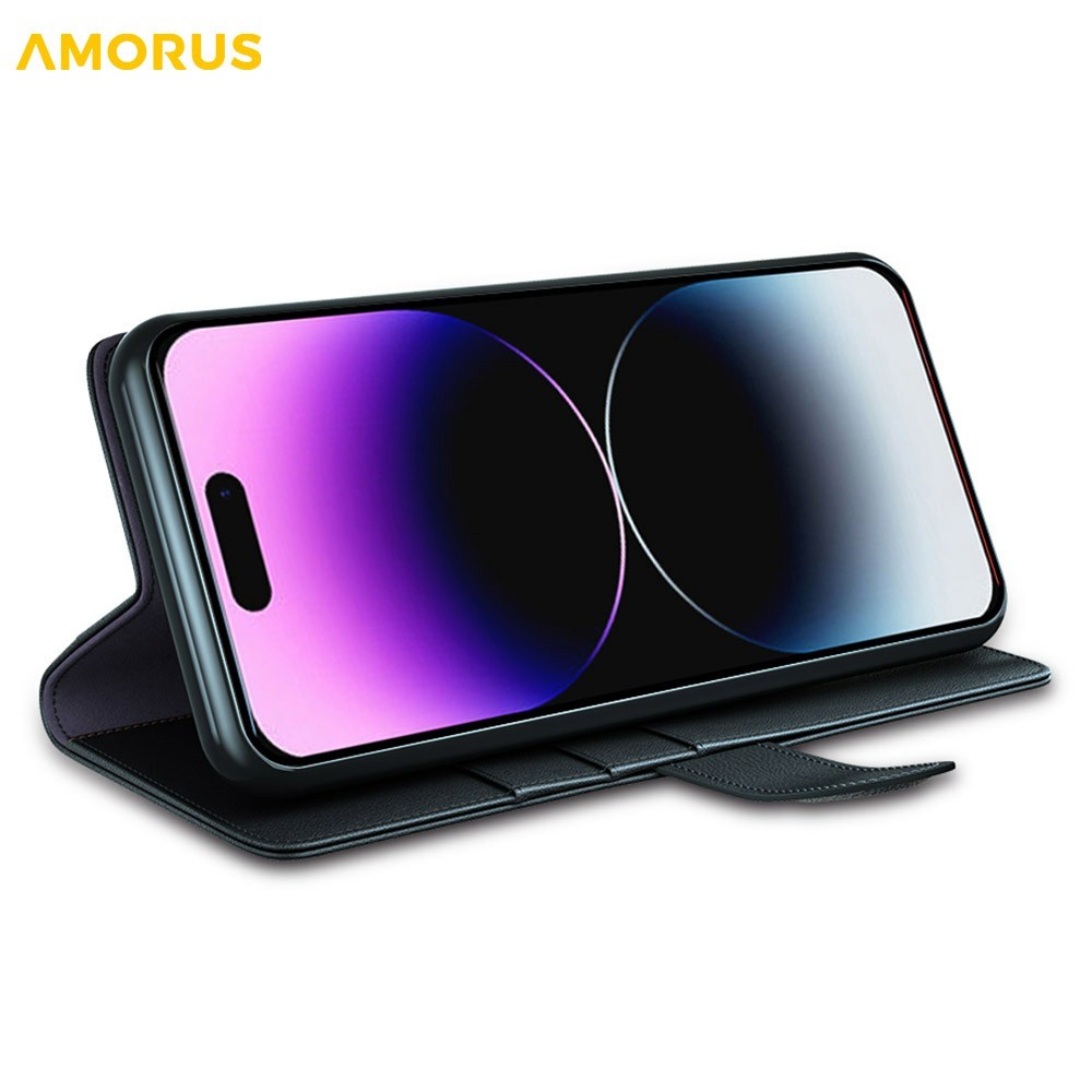 AMORUS For iPhone 13 Pro Max Stand Cases Calf Texture Genuine Split Leather Wallet Phone Cover - Black
