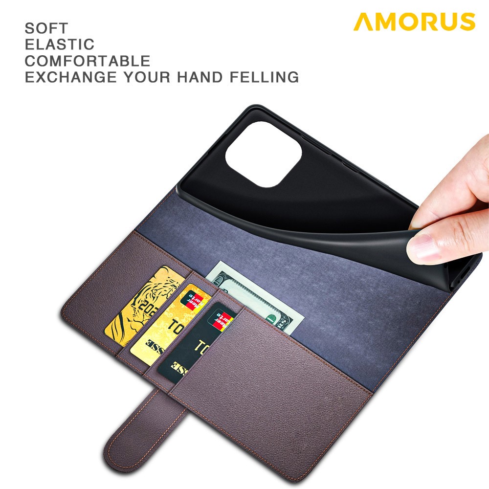• AMORUS For iPhone 15 Plus Stand Cases Calf Texture Genuine Split Leather Wallet Phone Cover - Brown