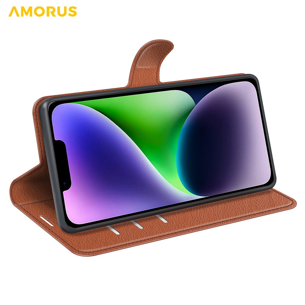 AMORUS For iPhone 15 Wallet Case Litchi Texture Shockproof Leather Flip Stand Phone Cover - Brown
