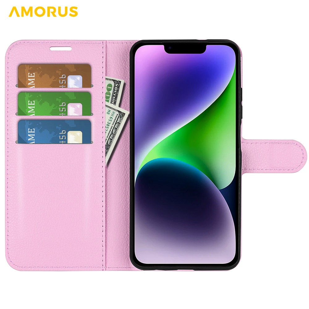 AMORUS For iPhone 15 Wallet Case Litchi Texture Shockproof Leather Flip Stand Phone Cover - Pink