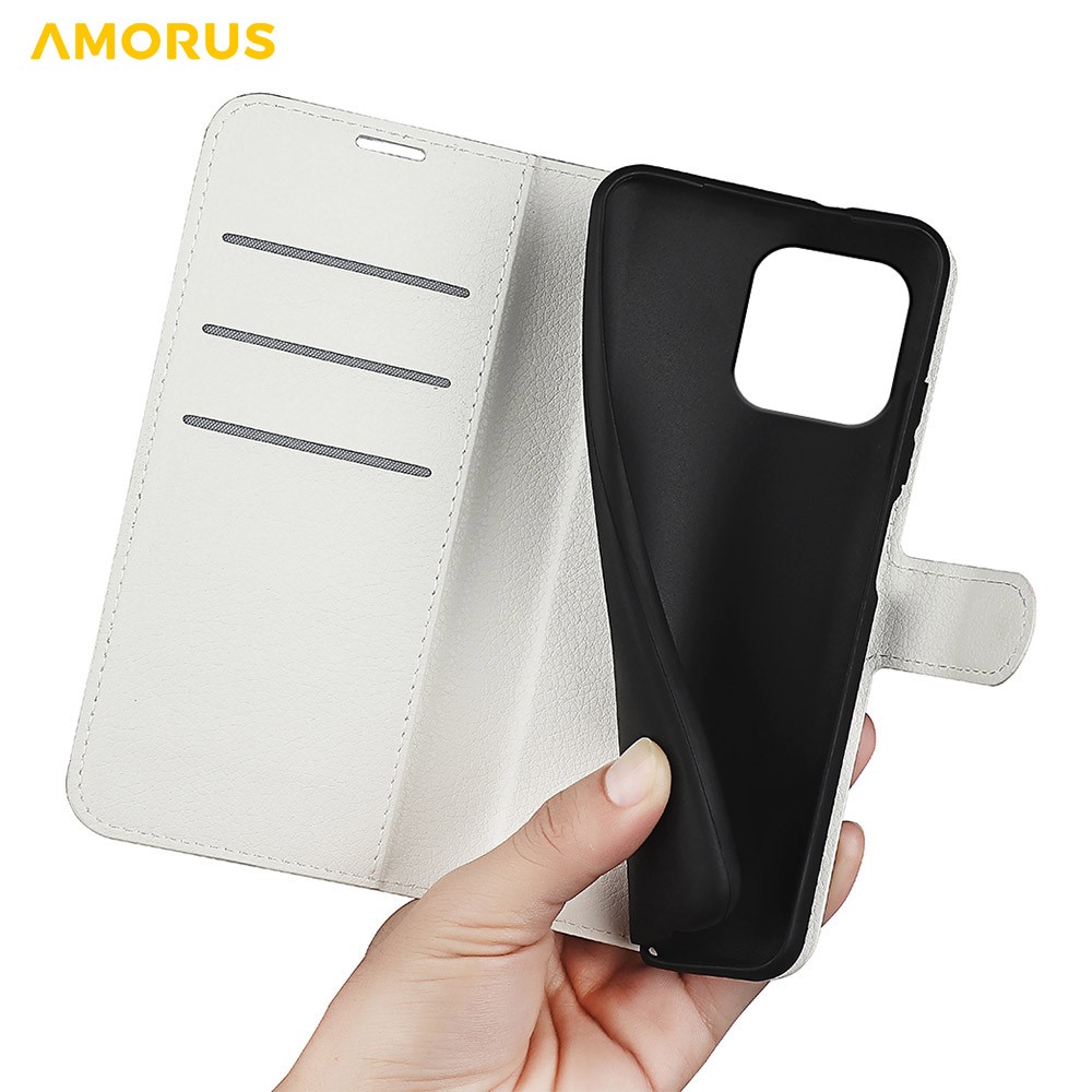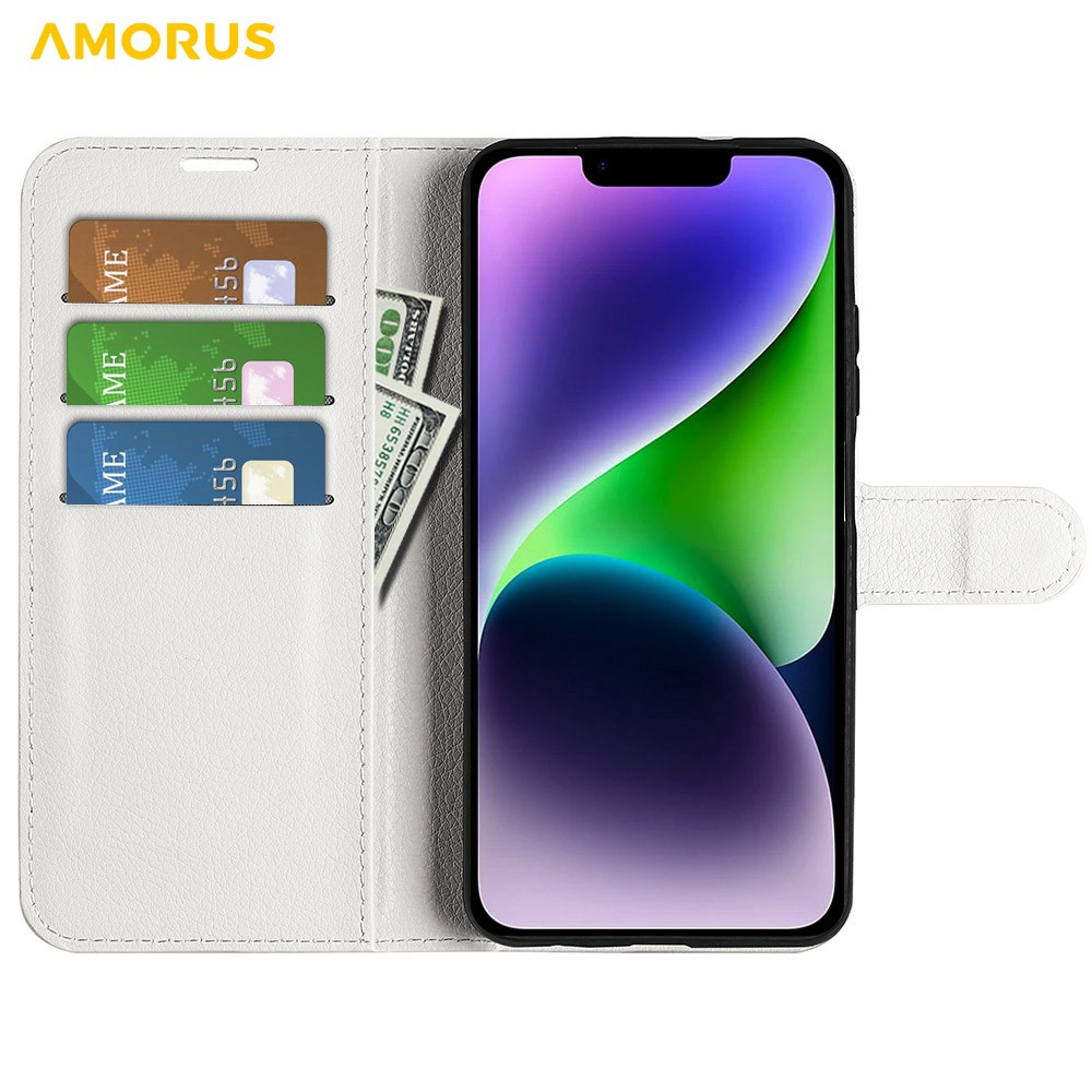 AMORUS For iPhone 15 Wallet Case Litchi Texture Shockproof Leather Flip Stand Phone Cover - White