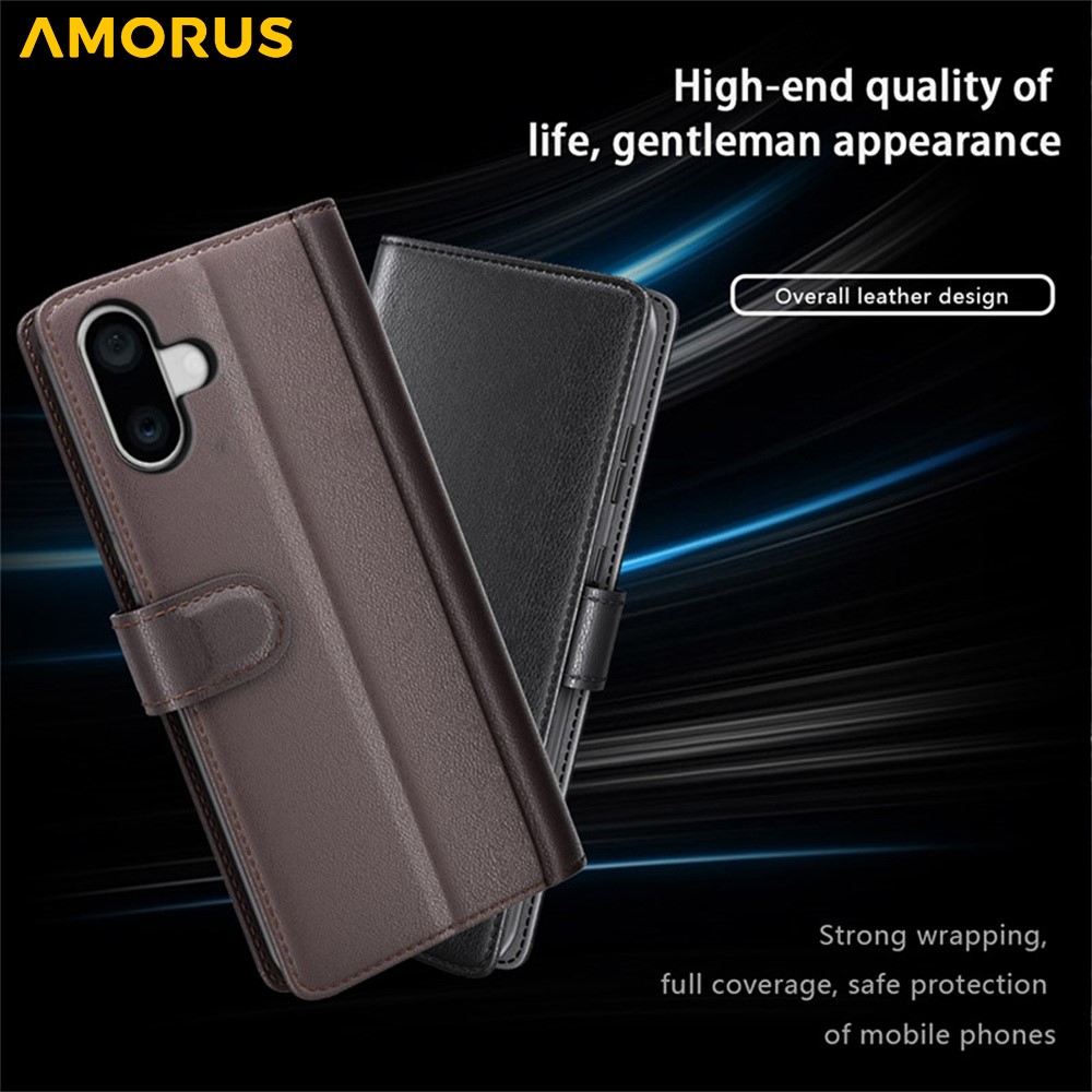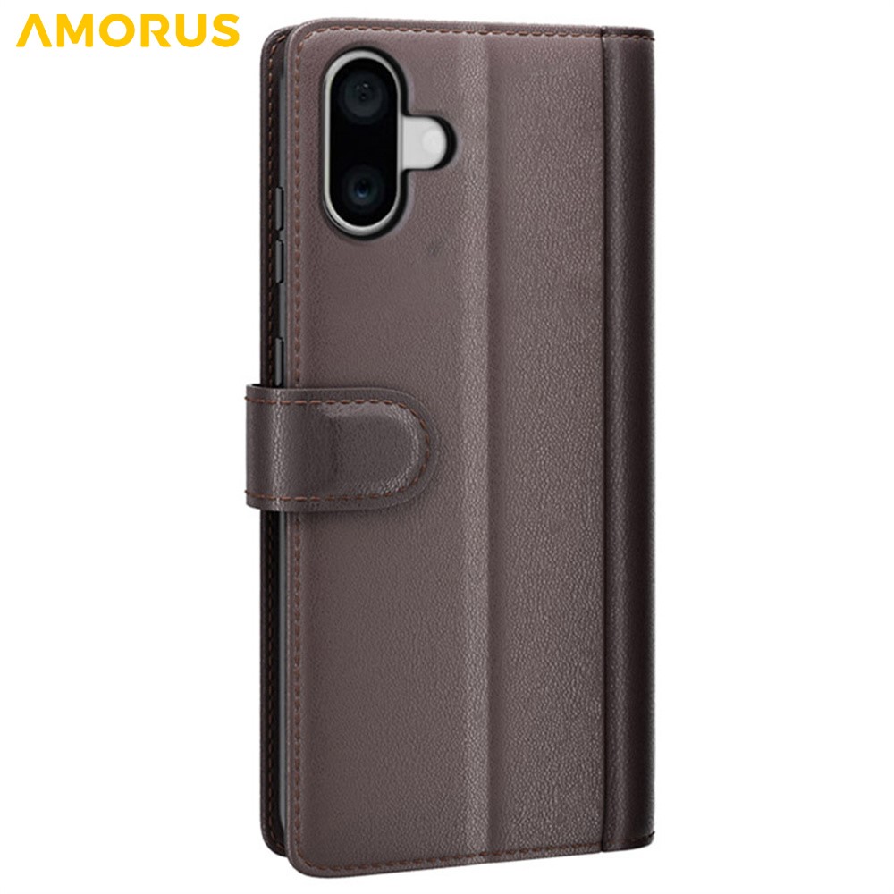 AMORUS For iPhone 16 Plus Stand Cases Calf Texture Genuine Split Leather Wallet Phone Cover – Brown