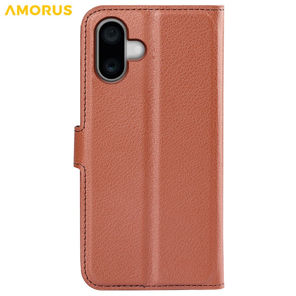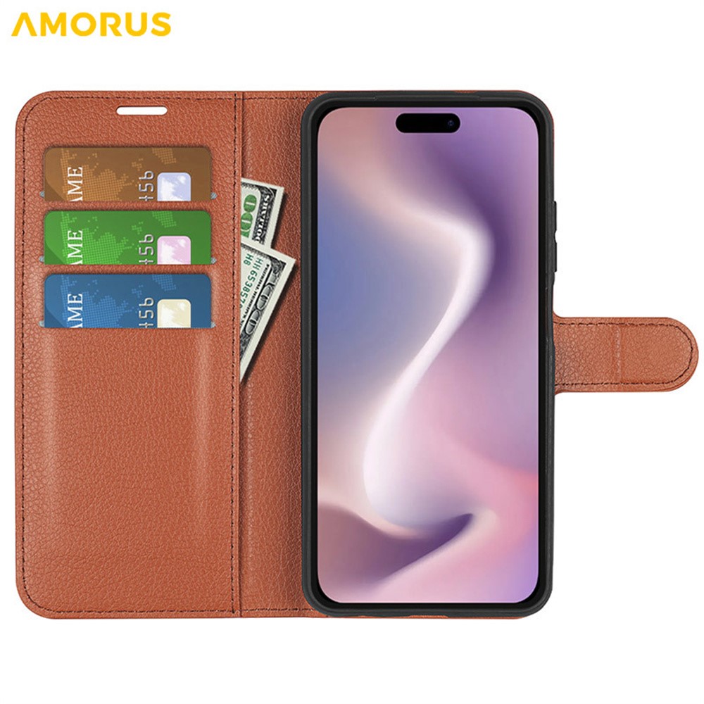 AMORUS For iPhone 16 Wallet Case Litchi Texture Shockproof Leather Flip Stand Phone Cover - Brown