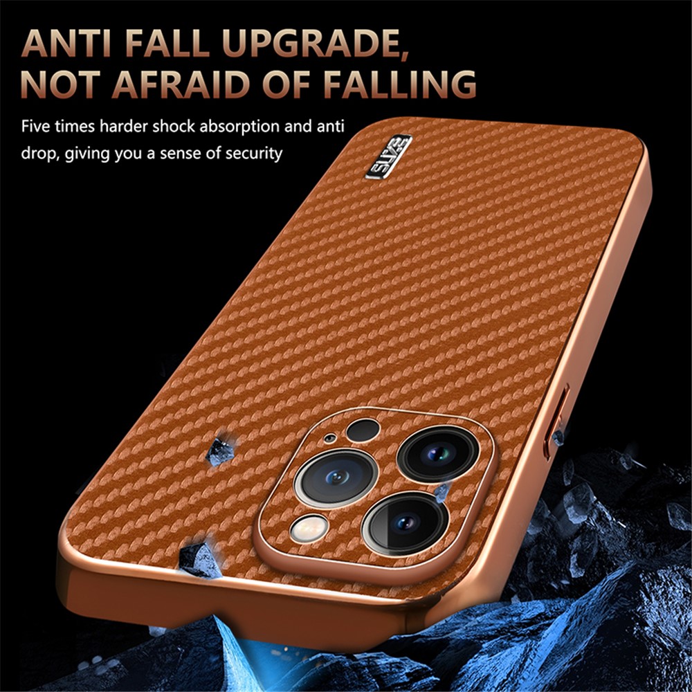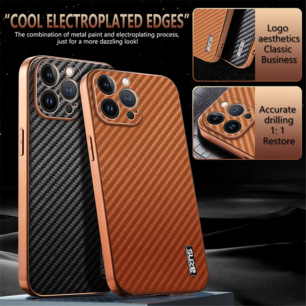 • AZNS For iPhone 13 Pro Case Electroplating Carbon Fiber Texture PU+TPU Phone Cover - Brown