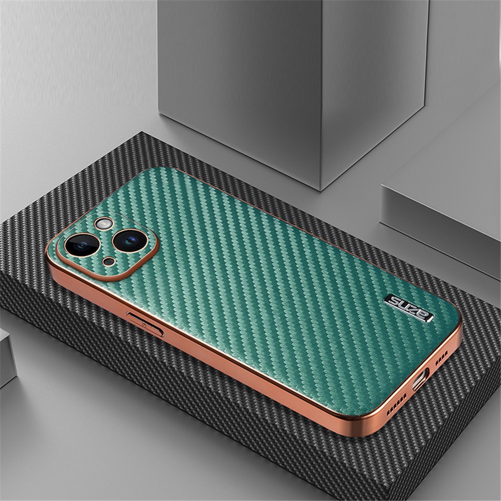 AZNS For iPhone 15 Case Electroplating Carbon Fiber Texture PU+TPU Phone Cover - Green $16.20