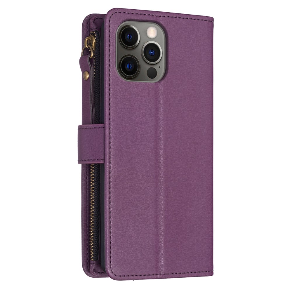 BF Style-19 for iPhone 12 / 12 Pro Anti-scratch Leather Case Zipper Pocket Stand Phone Wallet Cover – Dark Purple