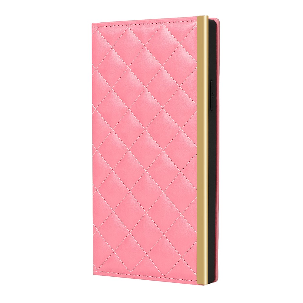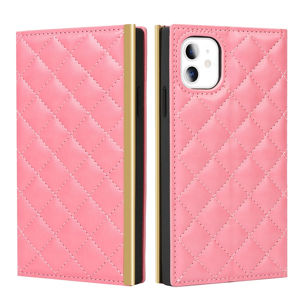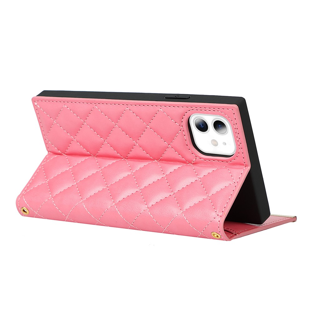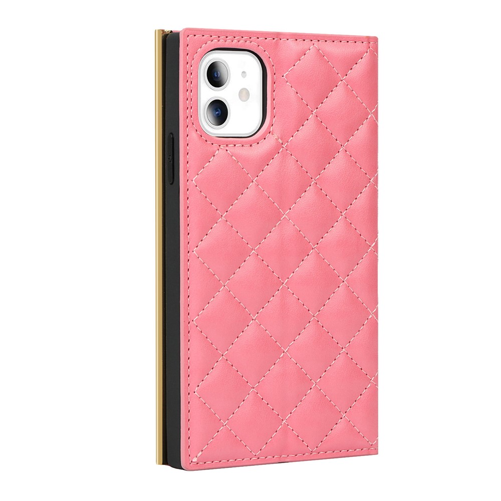 [Built-in Makeup Mirror] Grid Texture Leather Phone Case Crossbody Bag with Shoulder Strap for iPhone 12 mini 5.4 inch – Pink
