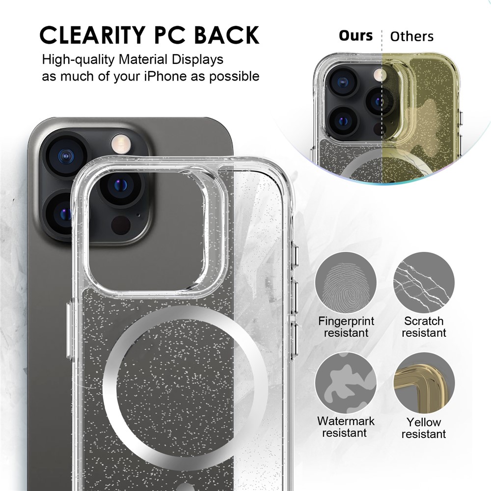 - Stylish Glitter Finish Crystal-clear case infused with glitter powder, adding a sparkling starry look while maintaining full transparency.