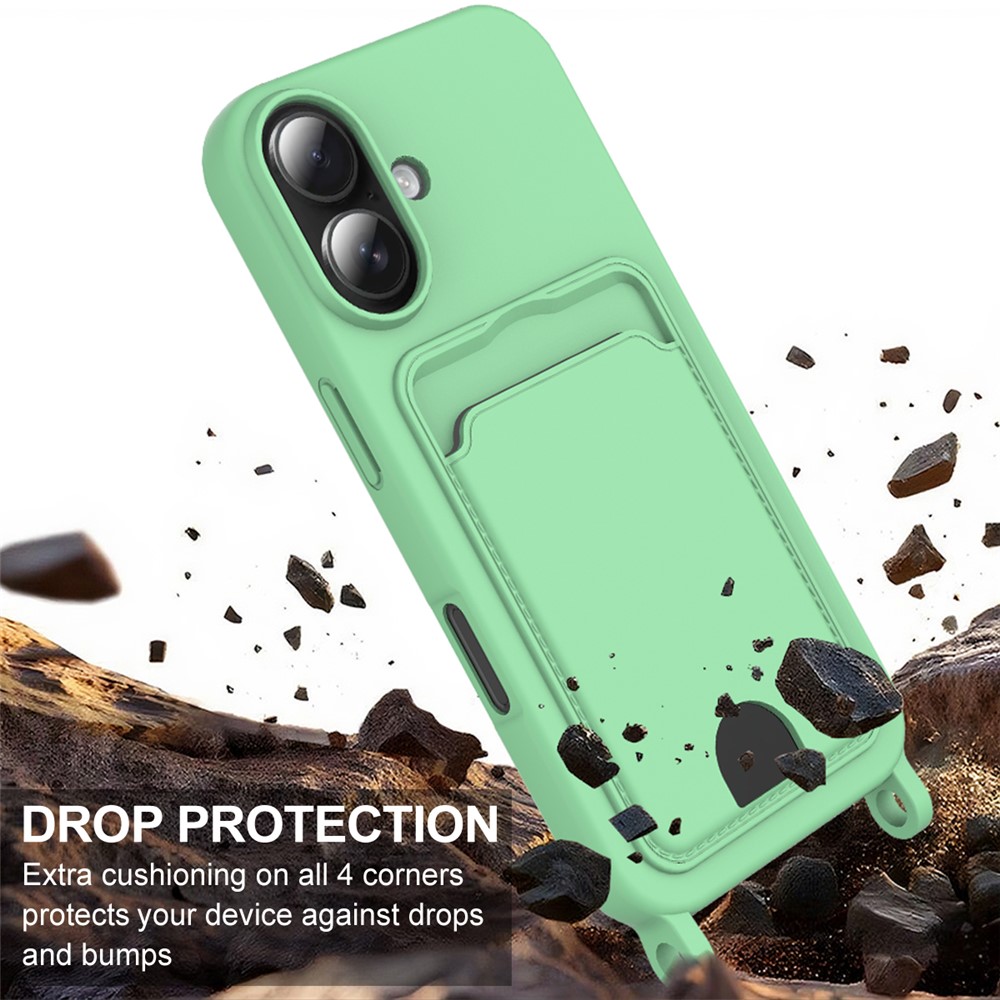 Bulk Purchasing For iPhone 16 Plus Case Liquid Silicone Card Holder Phone Back Cover with Short Strap - Green