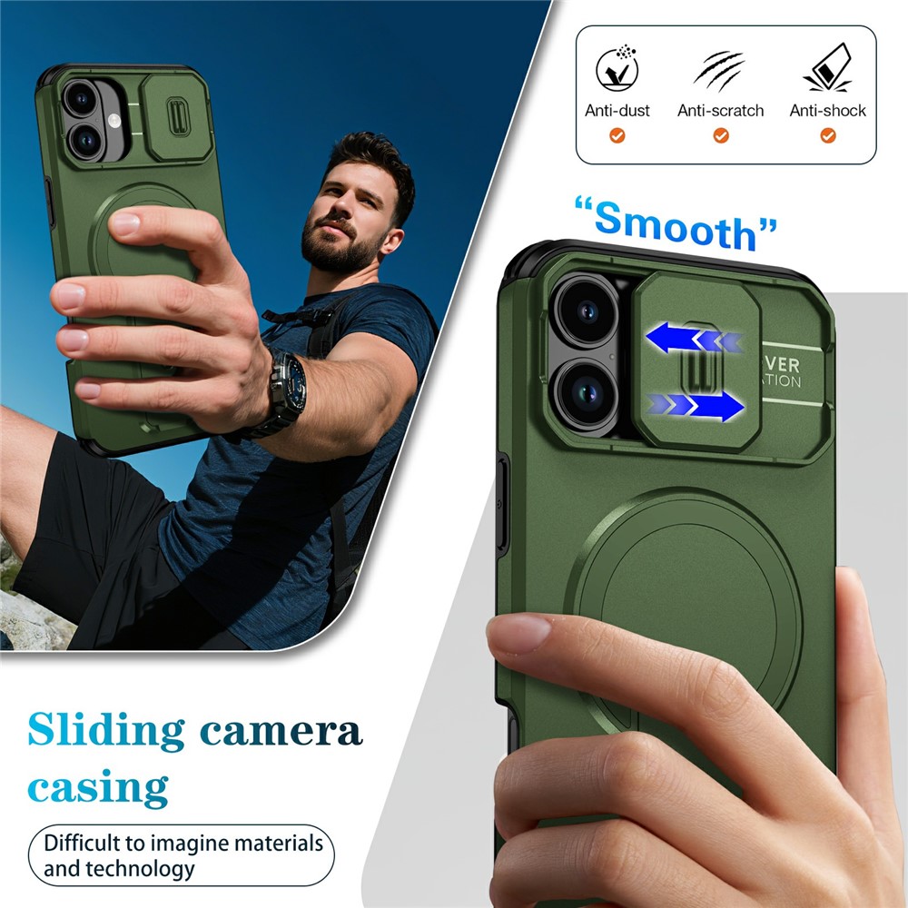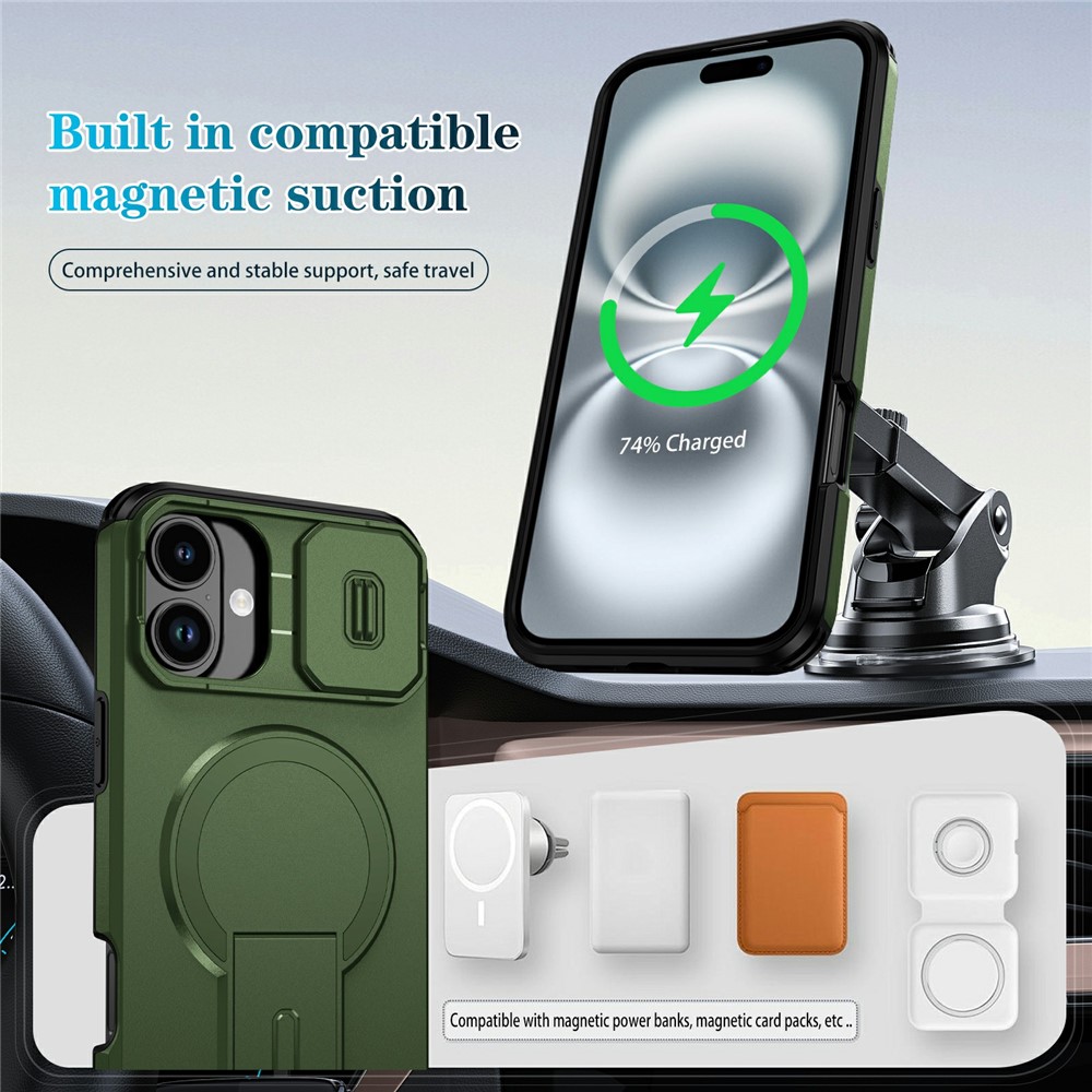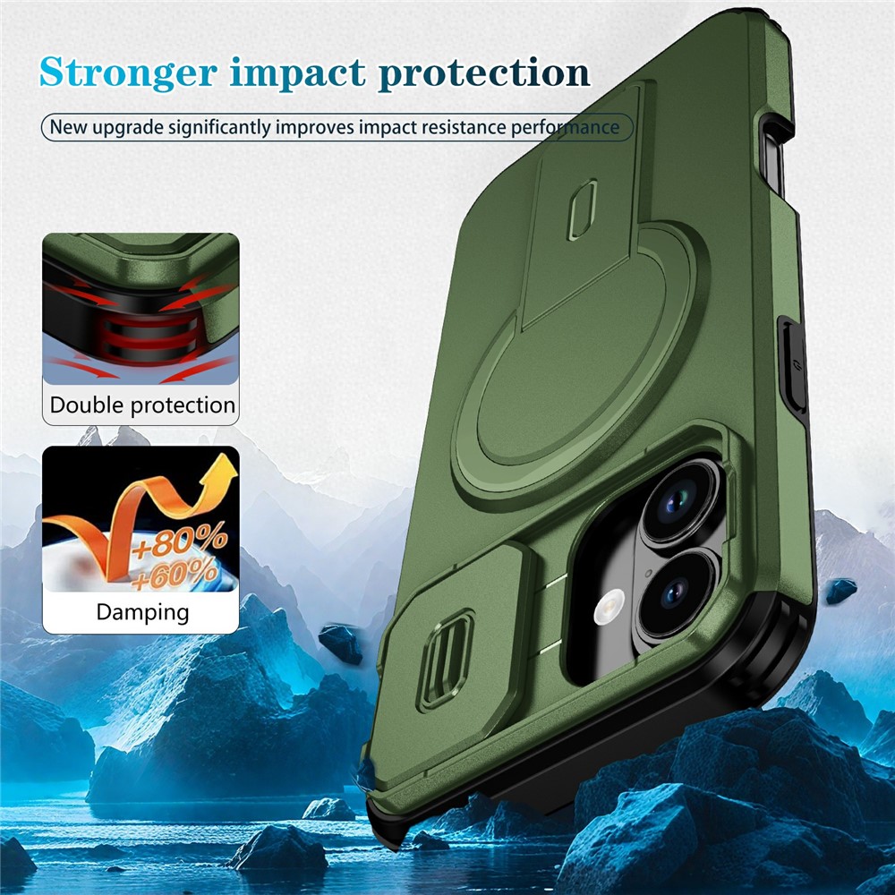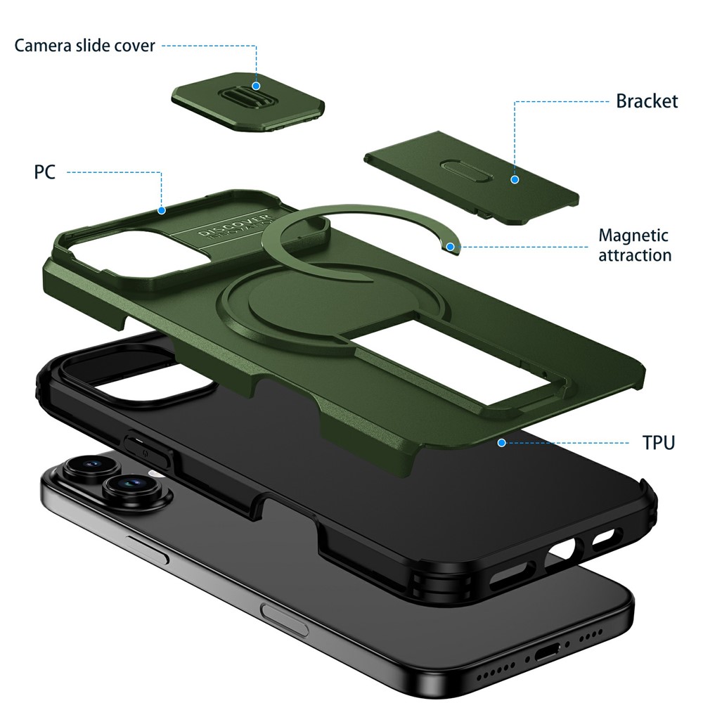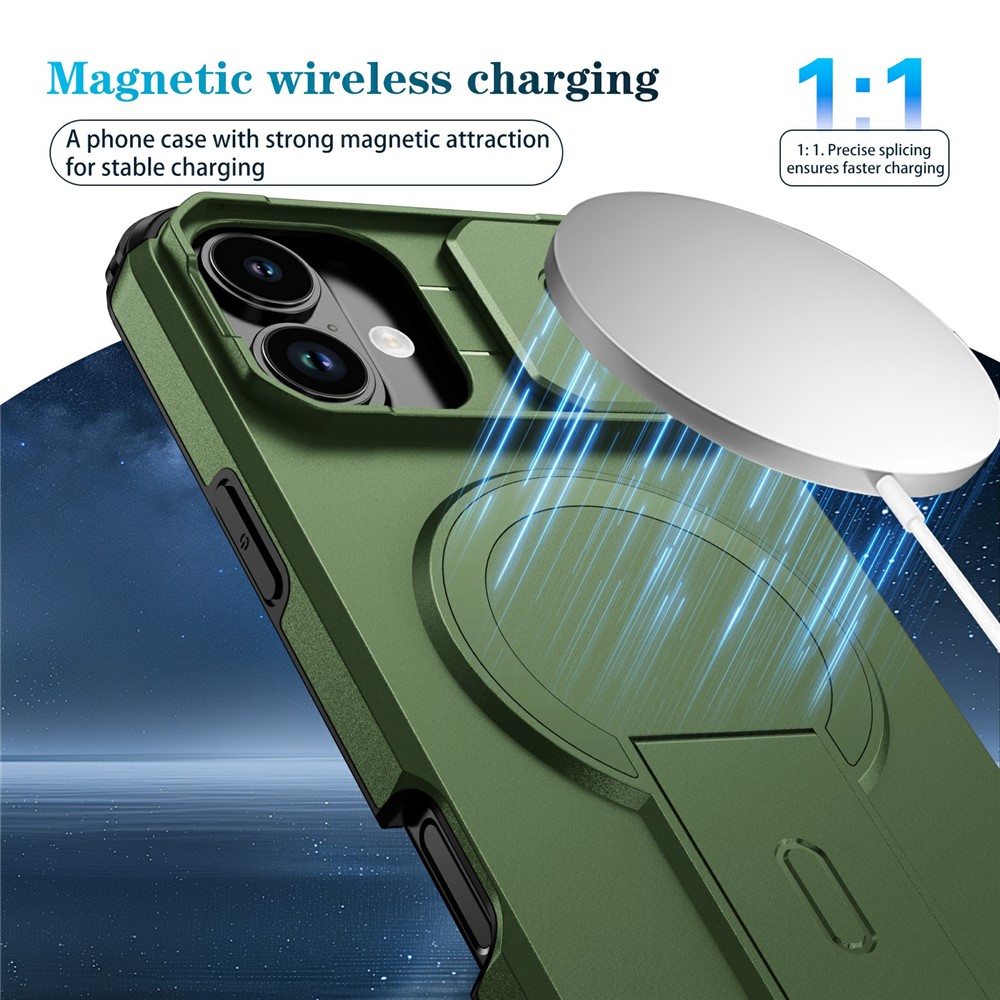 Bulk Purchasing For iPhone 16 Plus Magnetic Phone Case PC + TPU Cover with Hidden Kickstand and Sliding Camera Cover - Green