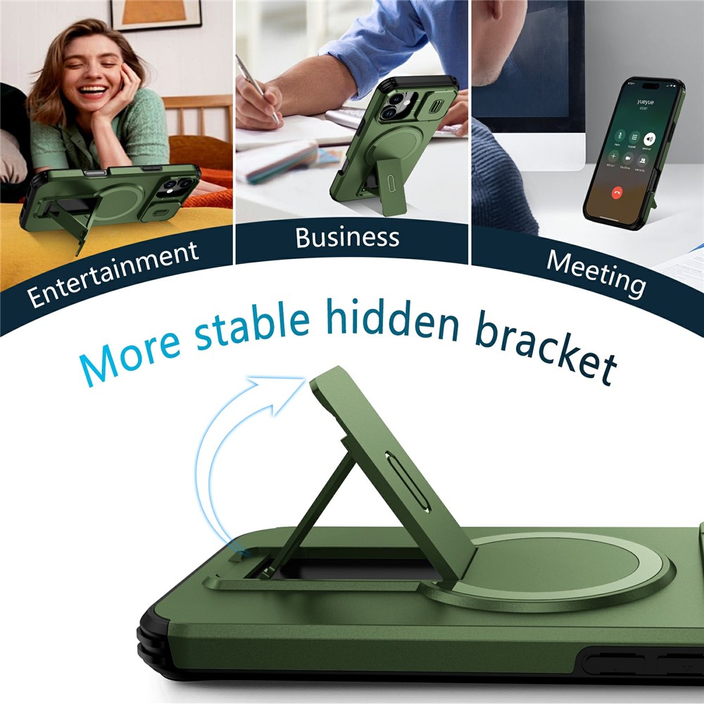 Bulk Purchasing For iPhone 16 Plus Magnetic Phone Case PC + TPU Cover with Hidden Kickstand and Sliding Camera Cover – Green