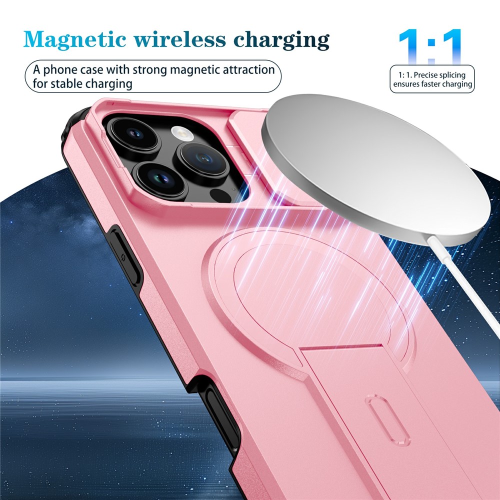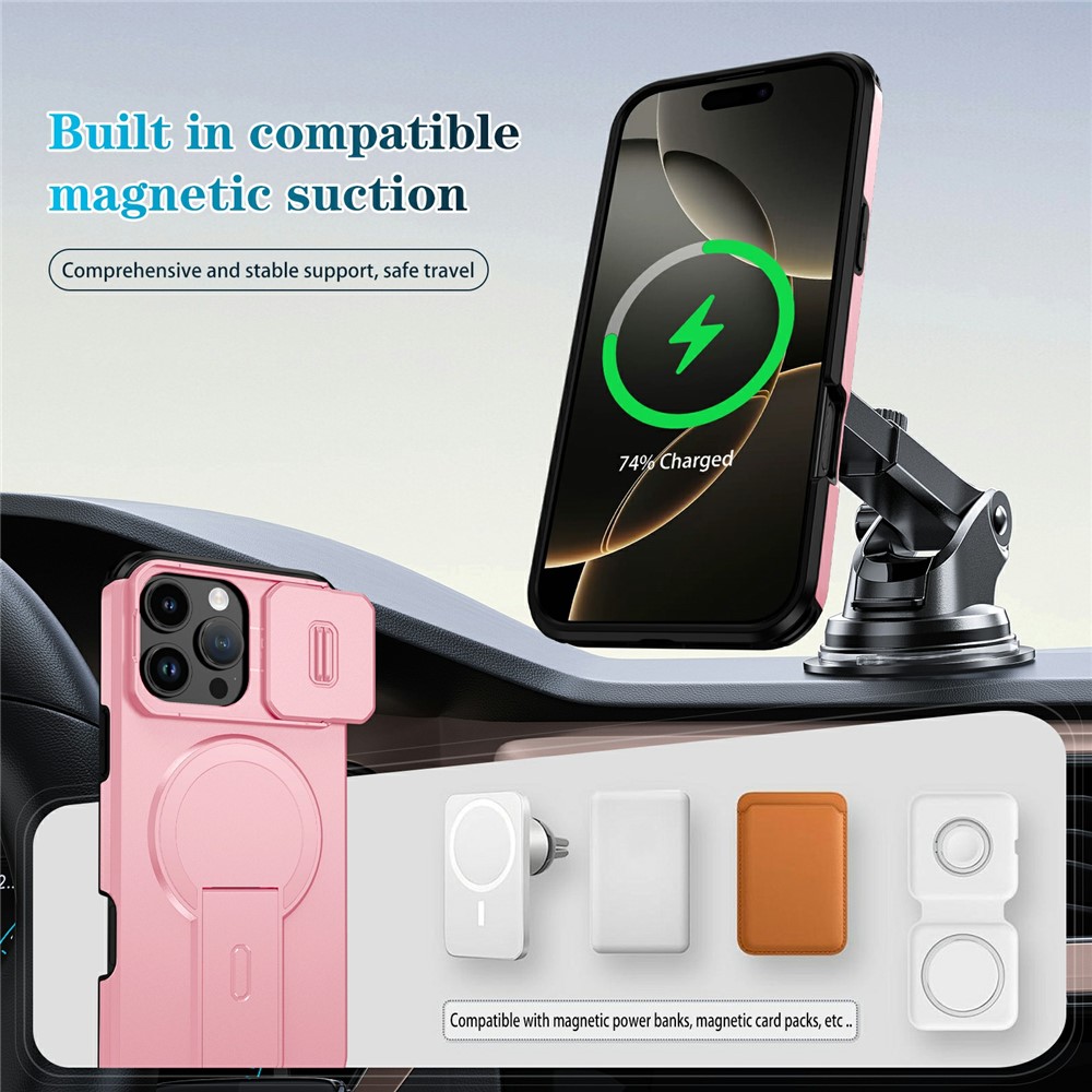 Bulk Purchasing For iPhone 16 Pro Magnetic Phone Case PC + TPU Cover with Hidden Kickstand and Sliding Camera Cover – Pink