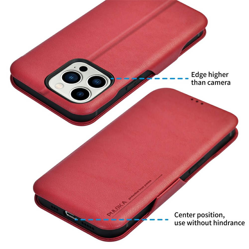 Bulk Purchasing PULOKA Calf Skin Series For iPhone 13 Pro Max Case RFID Blocking Stand Leather Phone Cover – Red