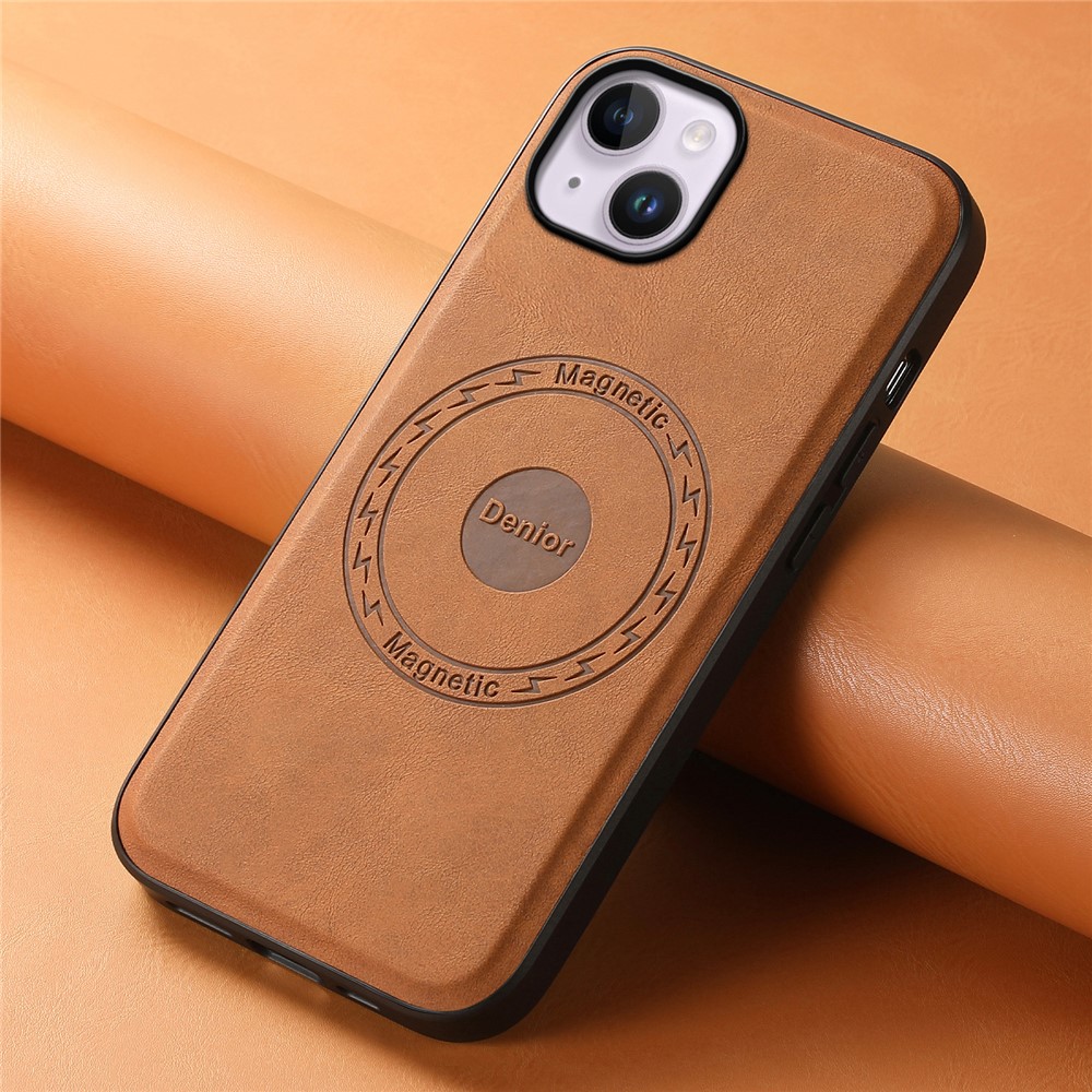 DENIOR A11 For iPhone 13 / 14 Magnetic Case Retro Leather Coated PC+TPU Anti-Scratch Cover – Brown