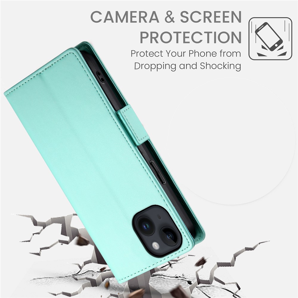 DF-010 For iPhone 14 Case Solid Color PU Leather Wallet Drop-proof Phone Cover – Mint Green