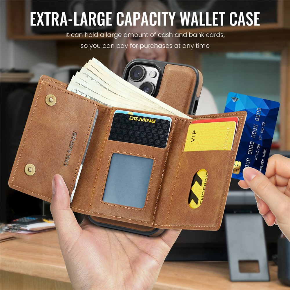 - Detachable Magnetic Trifold Wallt Includes a removable magnetic wallet with three folds, capable of holding cards, IDs, and cash, offering both convenience and functionality