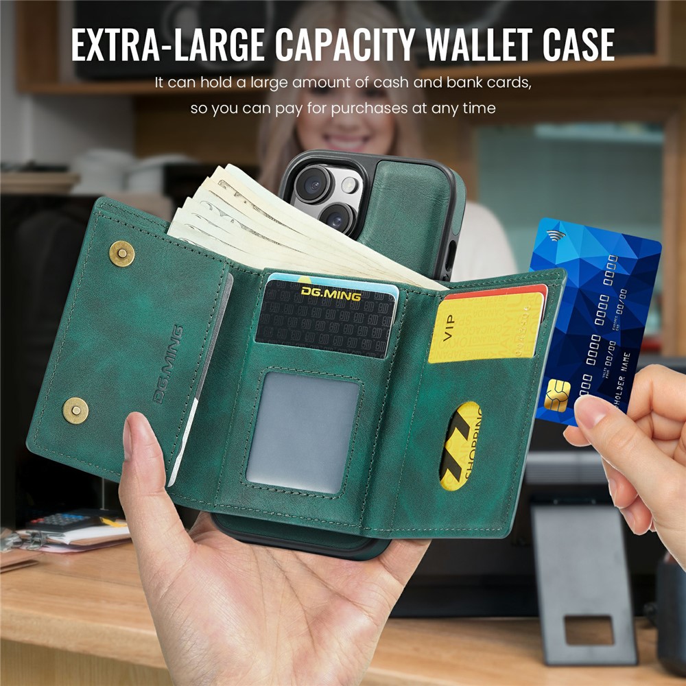 - Detachable Magnetic Trifold Wallt Includes a removable magnetic wallet with three folds, capable of holding cards, IDs, and cash, offering both convenience and functionality