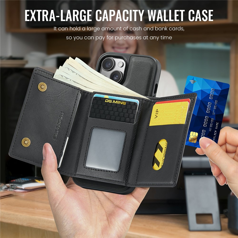- Detachable Magnetic Trifold Wallt Includes a removable magnetic wallet with three folds, capable of holding cards, IDs, and cash, offering both convenience and functionality