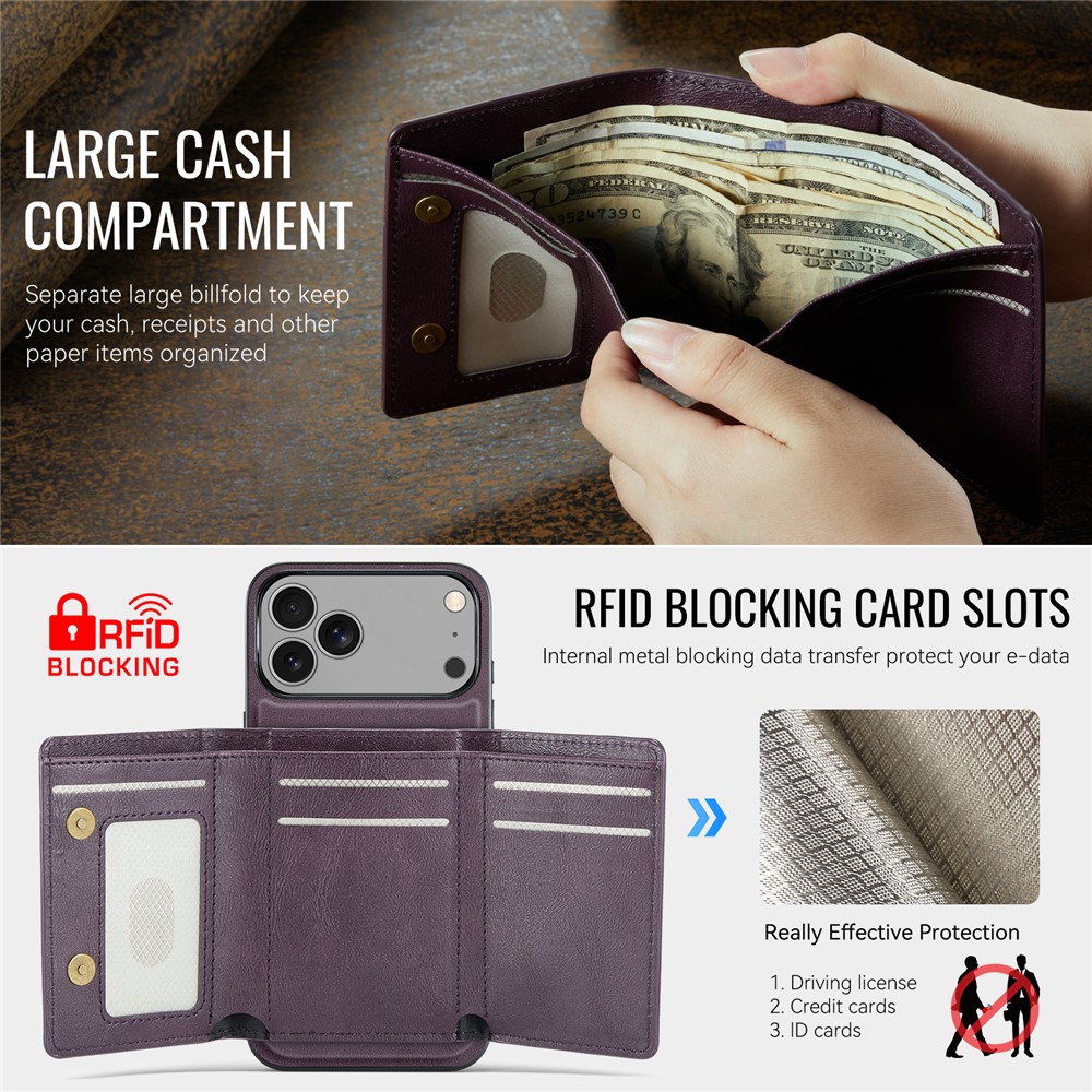 - Magnetic Wallet Function Features a detachable tri-fold wallet with multiple card slots, a cash pocket, and coin storage, keeping your essentials organized and secure.