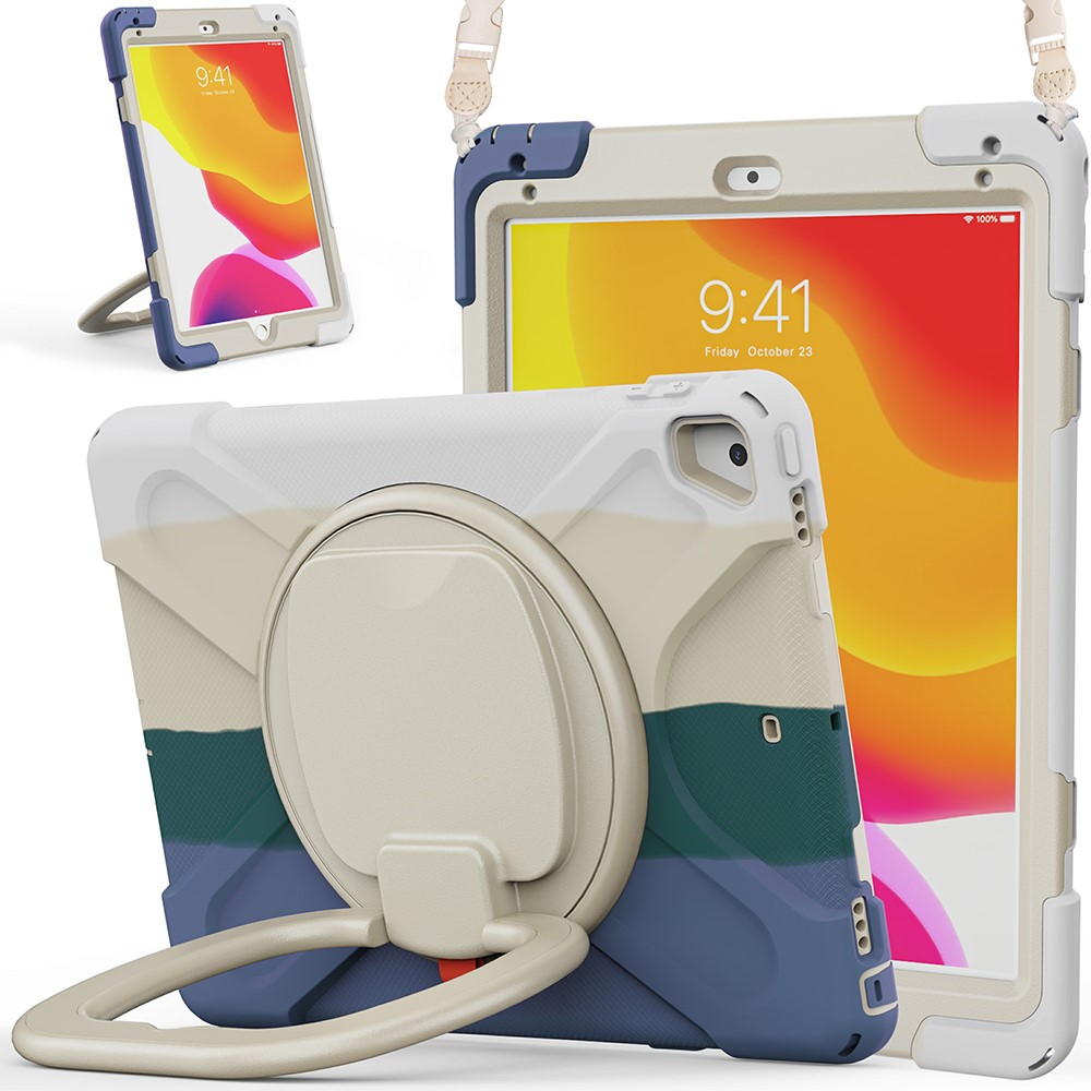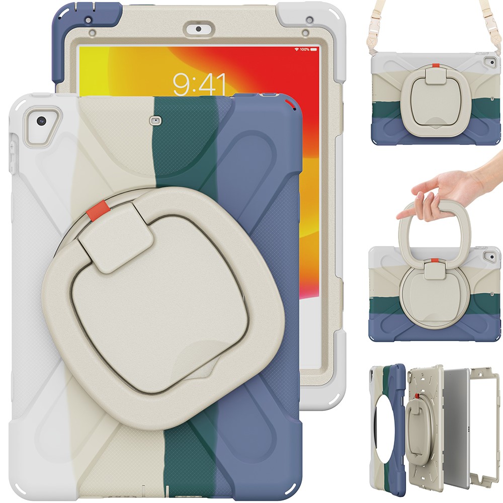 Flexible Tablet Cover with 360 Degree Swivel Kickstand + Shoulder Strap (B Style) for iPad 9.7-inch (2017) / (2018) / Air 2 – Colorful / White