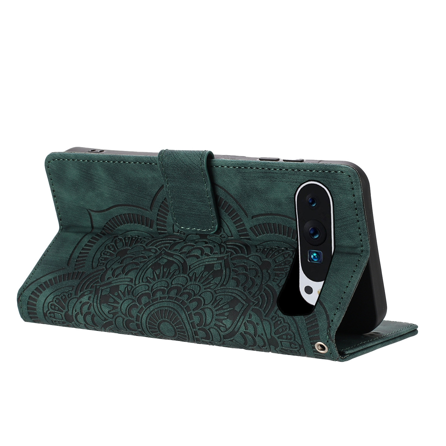 For Google Pixel 10 Case with 2Pcs Tempered Glass WANLONFENG MTL Series Mandala Leather Phone Cover - Midnight Green