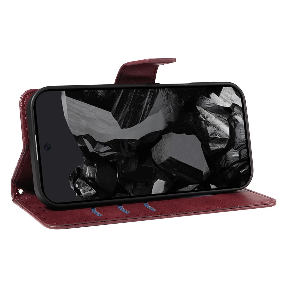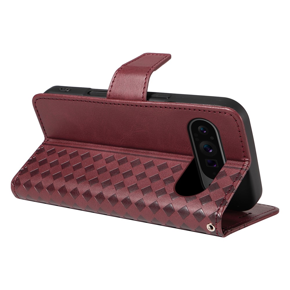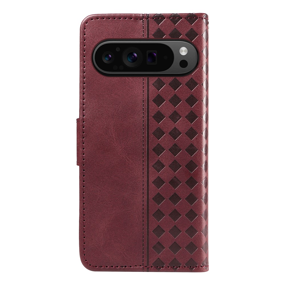 For Google Pixel 10 / Google Pixel 9 / Google Pixel 9 Pro / Google Pixel 10 Pro Leather Case Wallet Stand Grids Imprinted Phone Cover with Strap -  Wine Red
