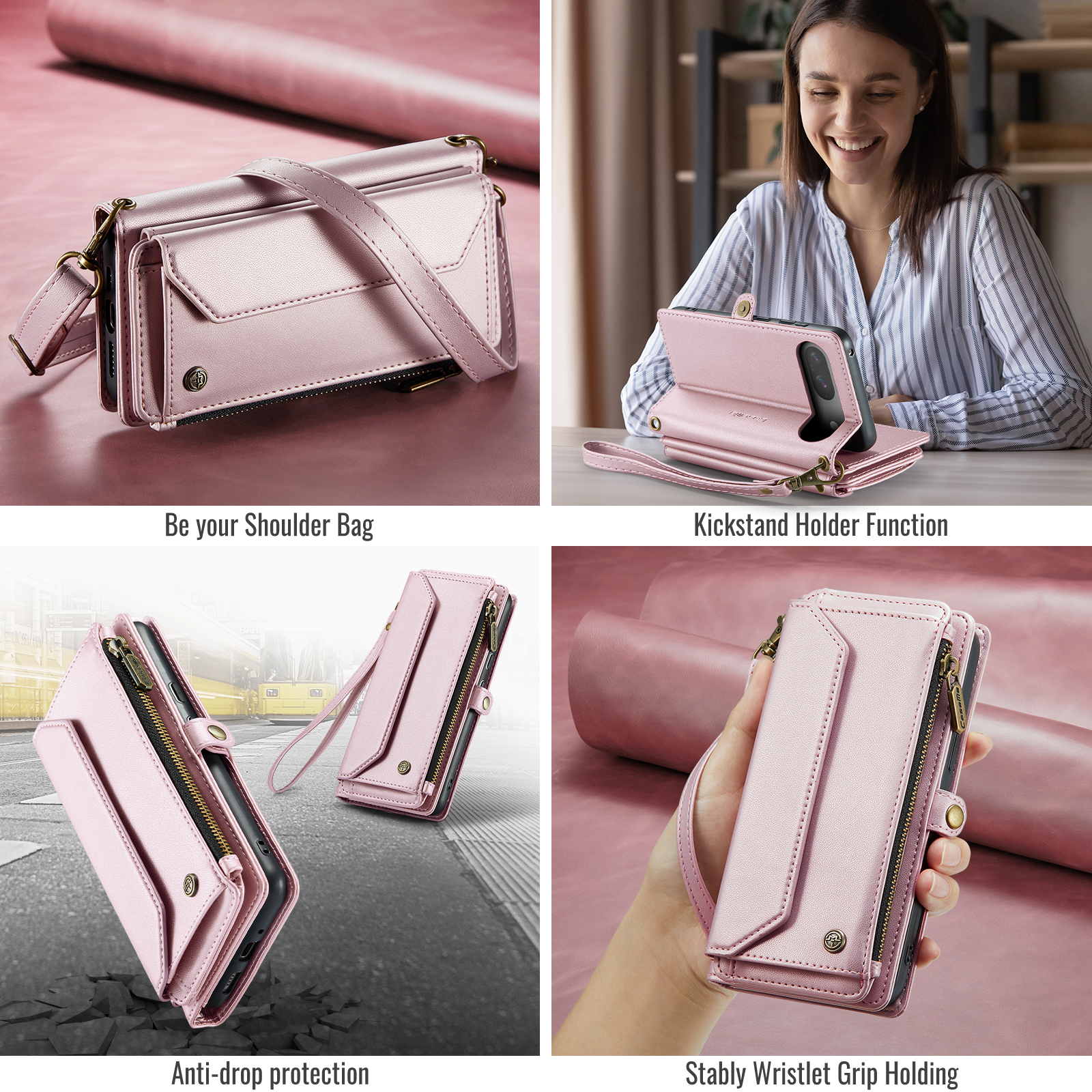 For Google Pixel 10 Pro / 10 / 9 Pro / 9 Leather Case CASEME C36 Zipper 10 Card Slots Phone Cover with Straps – Pink