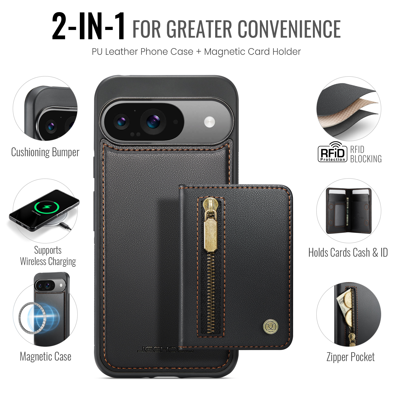 - Versatile Storage Features 1 zipper pocket on the front, 1 photo slot, 3 card slots, and a cash slot inside for maximum organization.