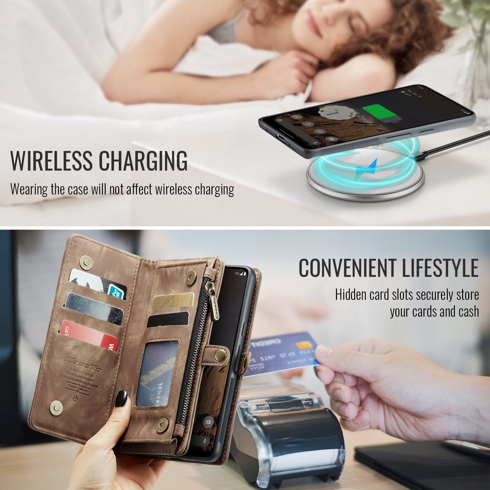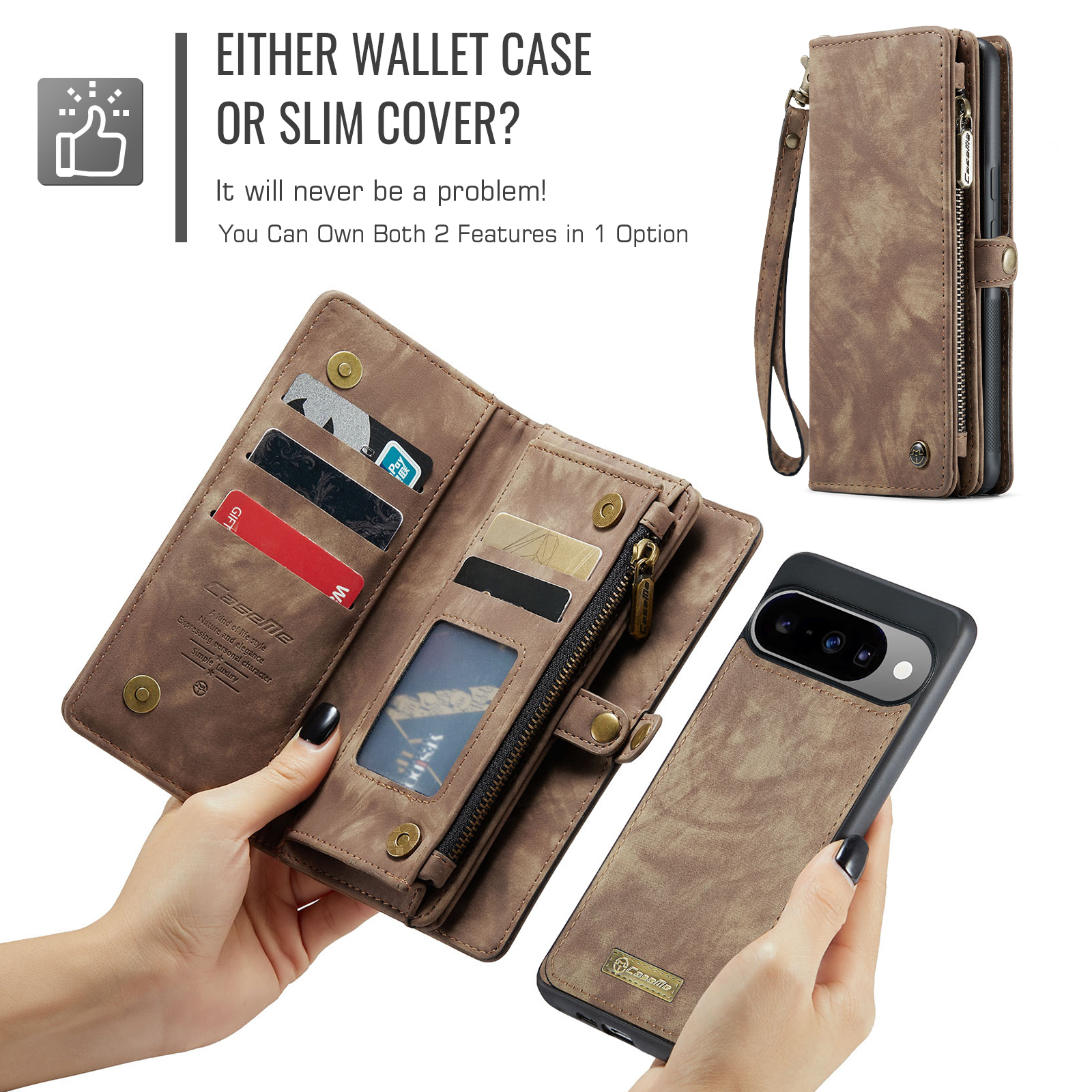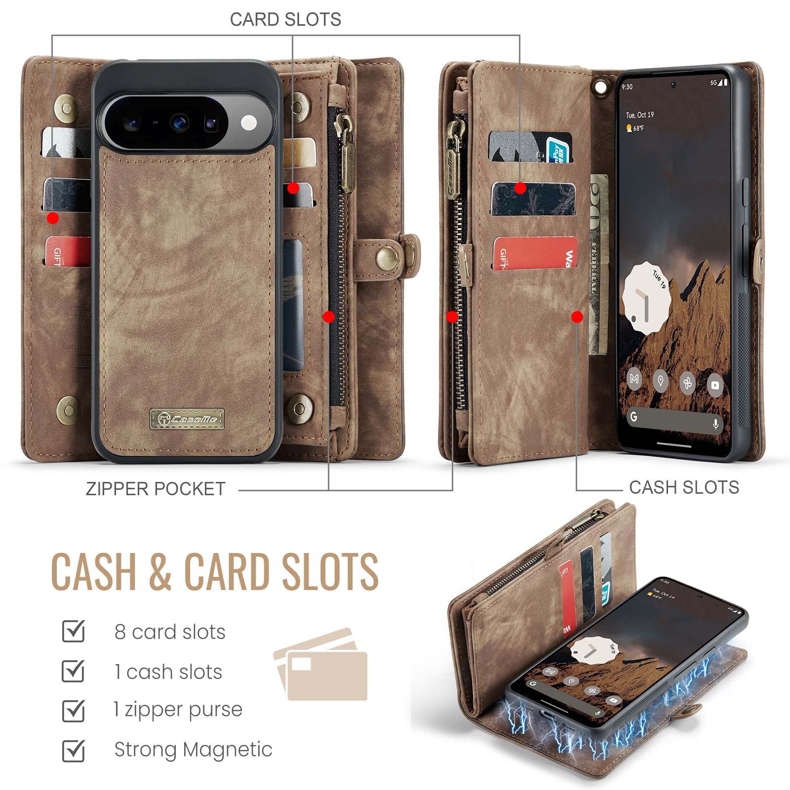 - Cash and Card Slots Zipper Pocket With 8 card slots, 1 cash slot, and 1 zipper purse for extra storage space without taking extra wallet when you go out