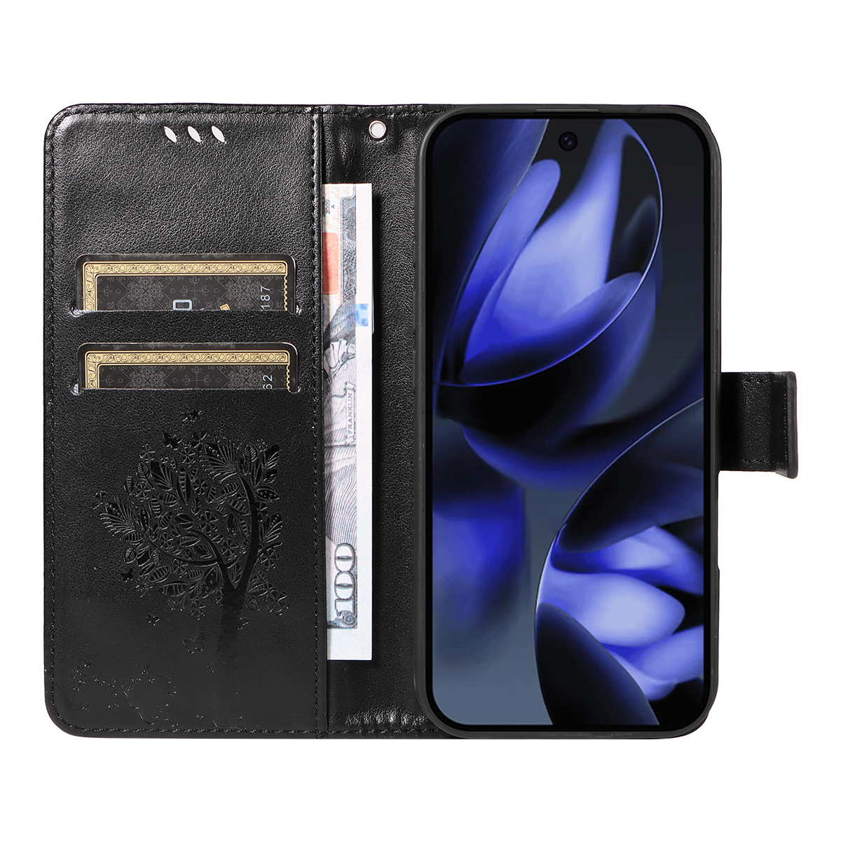 - Elegant Pattern Imprinted Features a stunning cat and tree pattern imprinted design on the front cover and the inner card slots area, adding a touch of luxury and uniqueness