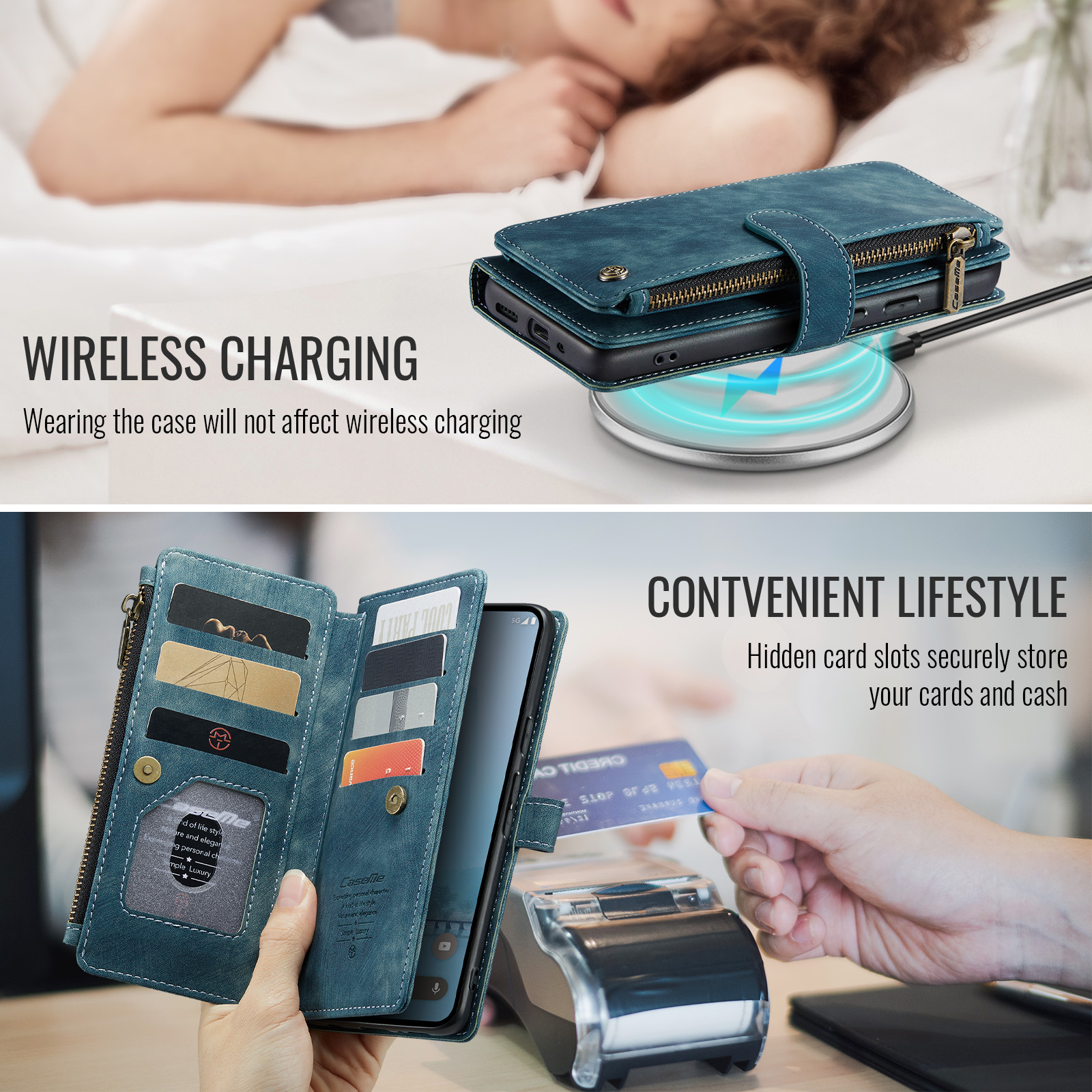 - Large Zipper Space Smoother, softer, and bigger space with the unique zipper design. Ideal for bills, cash, coins, and credit cards. The zipper won’t scratch the phone screen