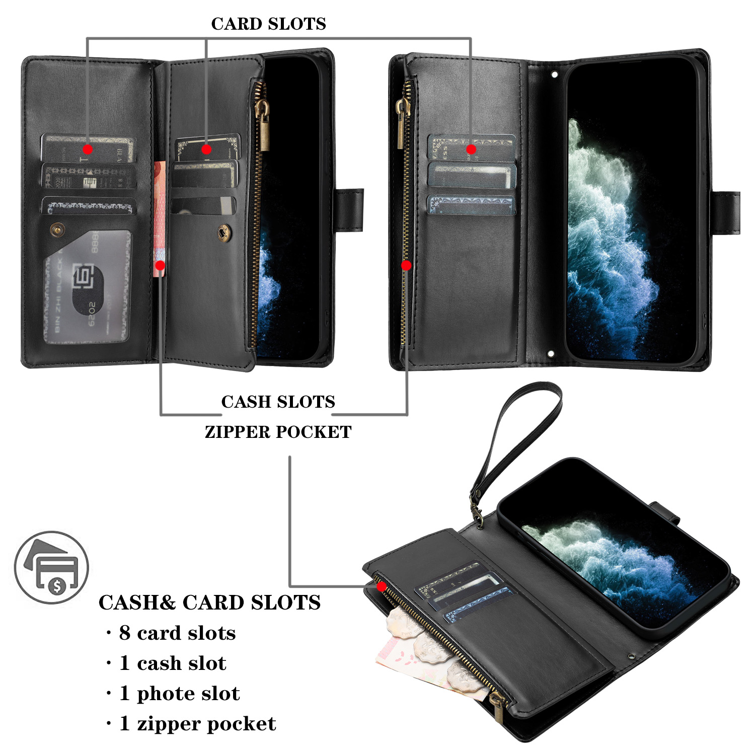 - Convenient Card and Cash Storage Includes 8 card slots, a photo slot, a cash slot and a zipper pocket for convenient storage of essentials, eliminating the need for an extra wallet