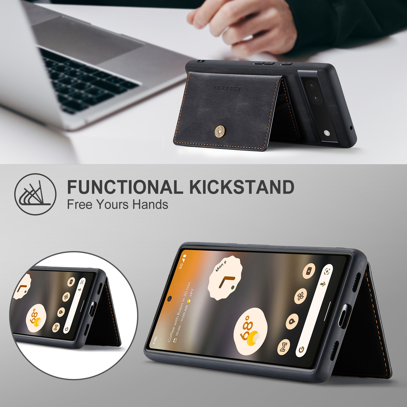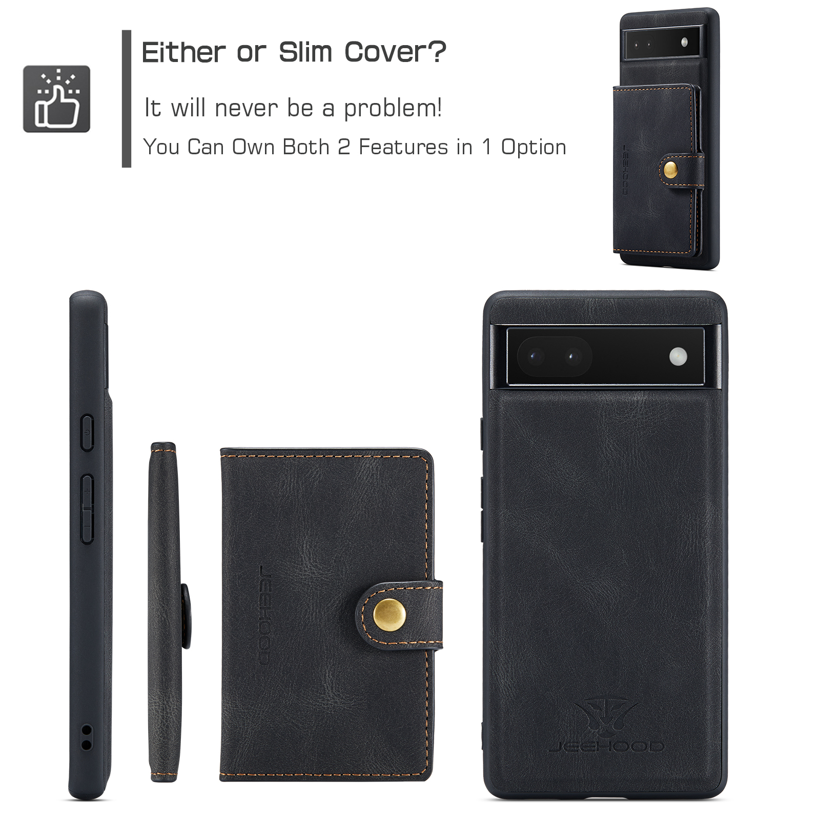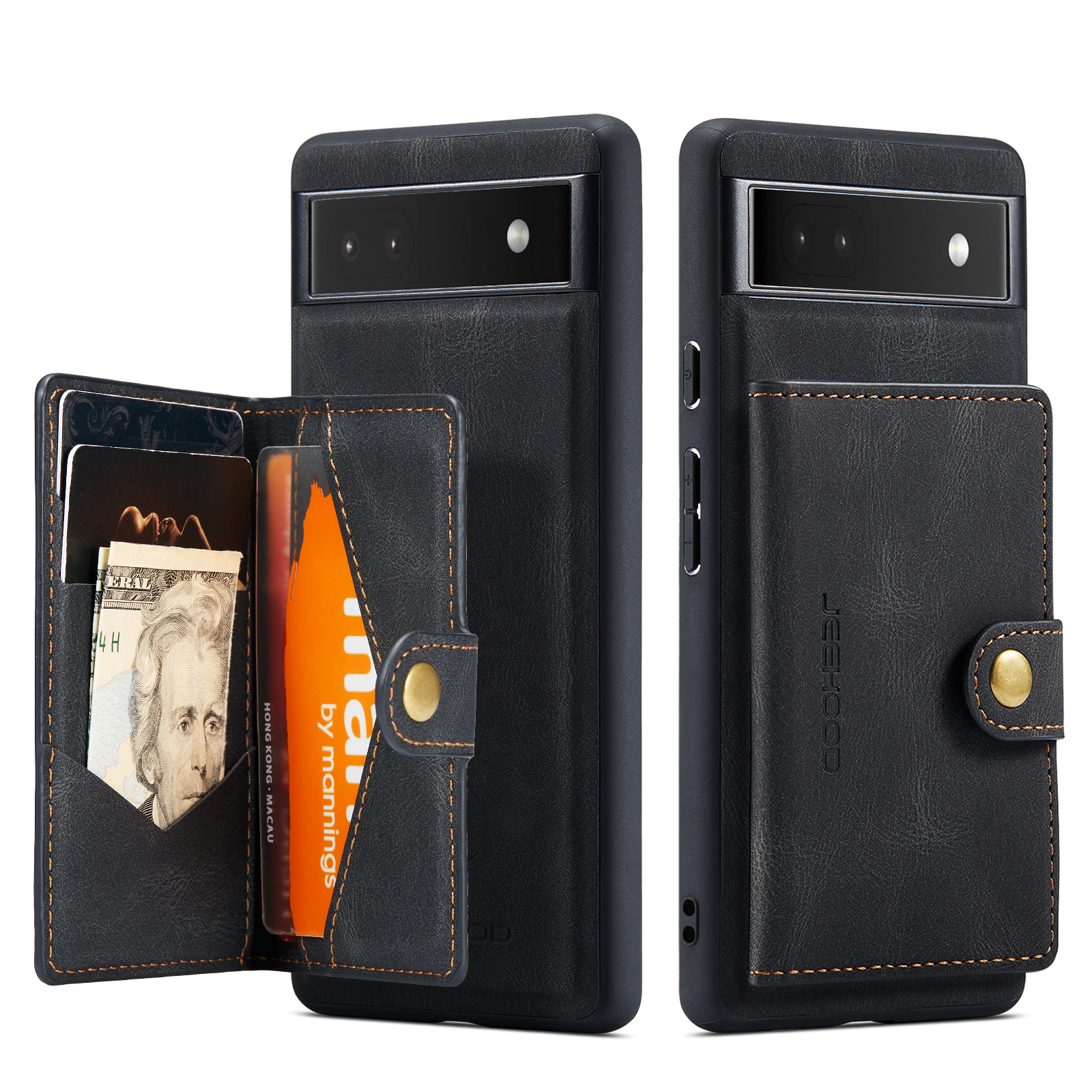 For Google Pixel 6a Case JEEHOOD J01 Retro Leather Phone Back Cover with Detachable Magnetic Card Holder – Black