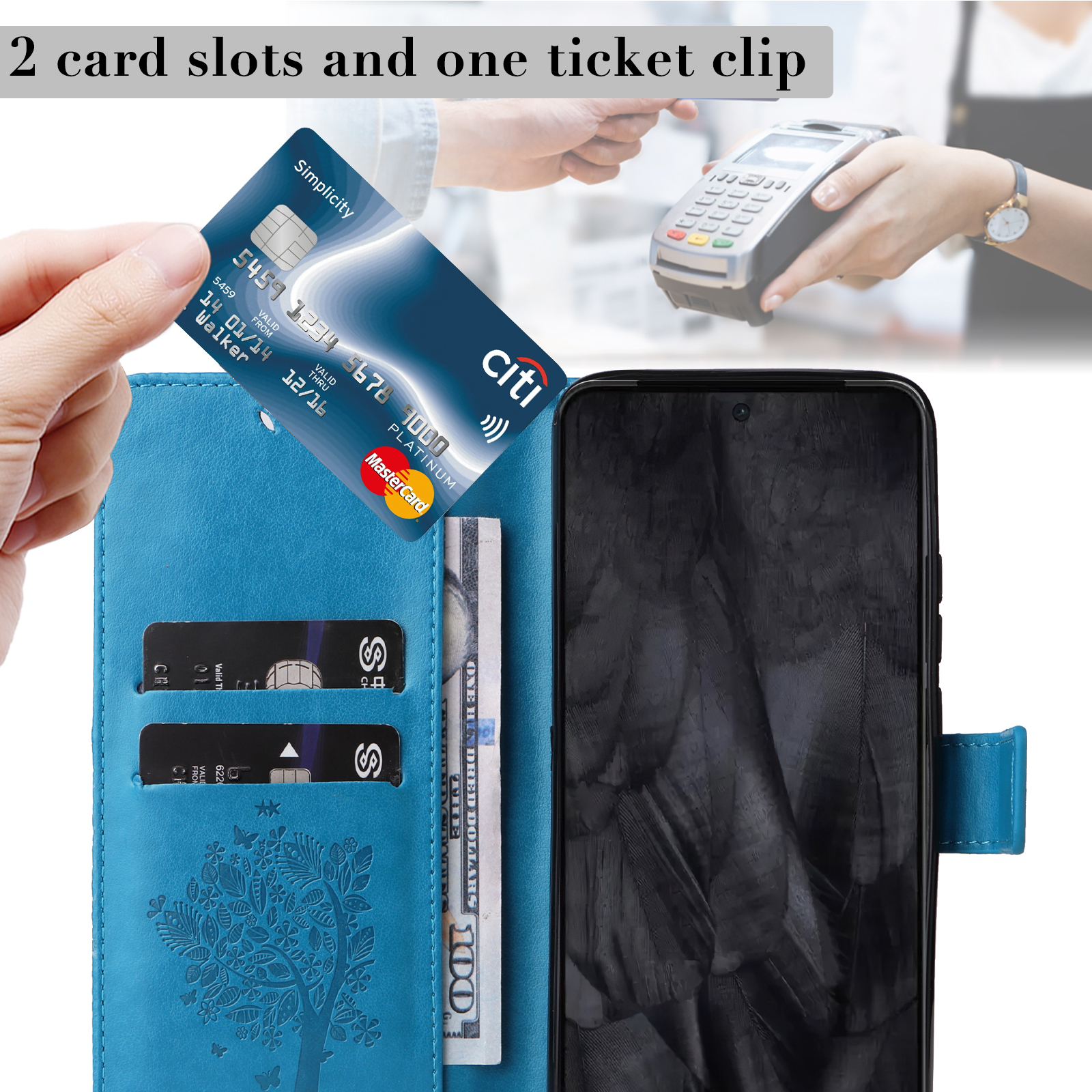 For Google Pixel 8 Pro Phone Case with Stand Cat Tree Pattern Leather Wallet Mobile Cover - Blue $15.72