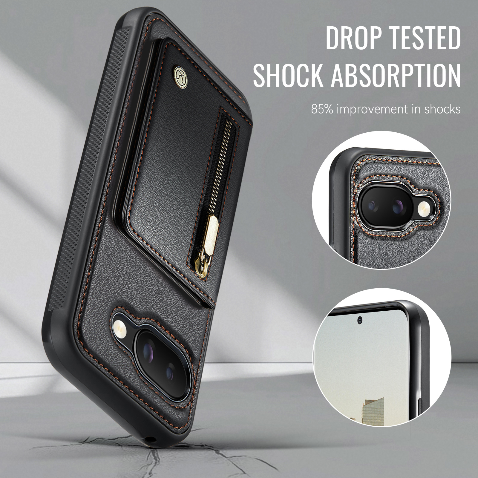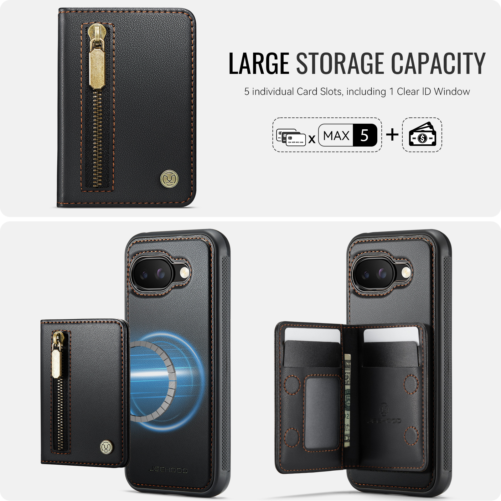- Versatile Storage Features 1 zipper pocket on the front, 1 photo slot, 3 card slots, and a cash slot inside for maximum organization.