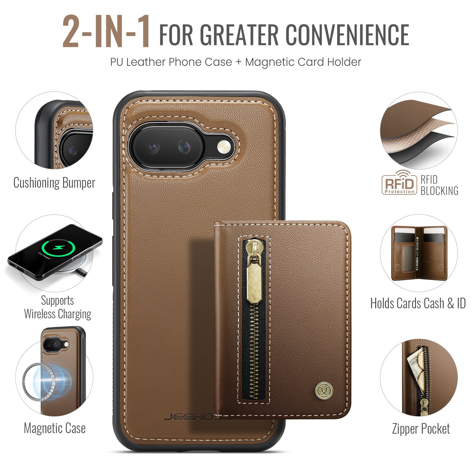 - Versatile Storage Features 1 zipper pocket on the front, 1 photo slot, 3 card slots, and a cash slot inside for maximum organization.
