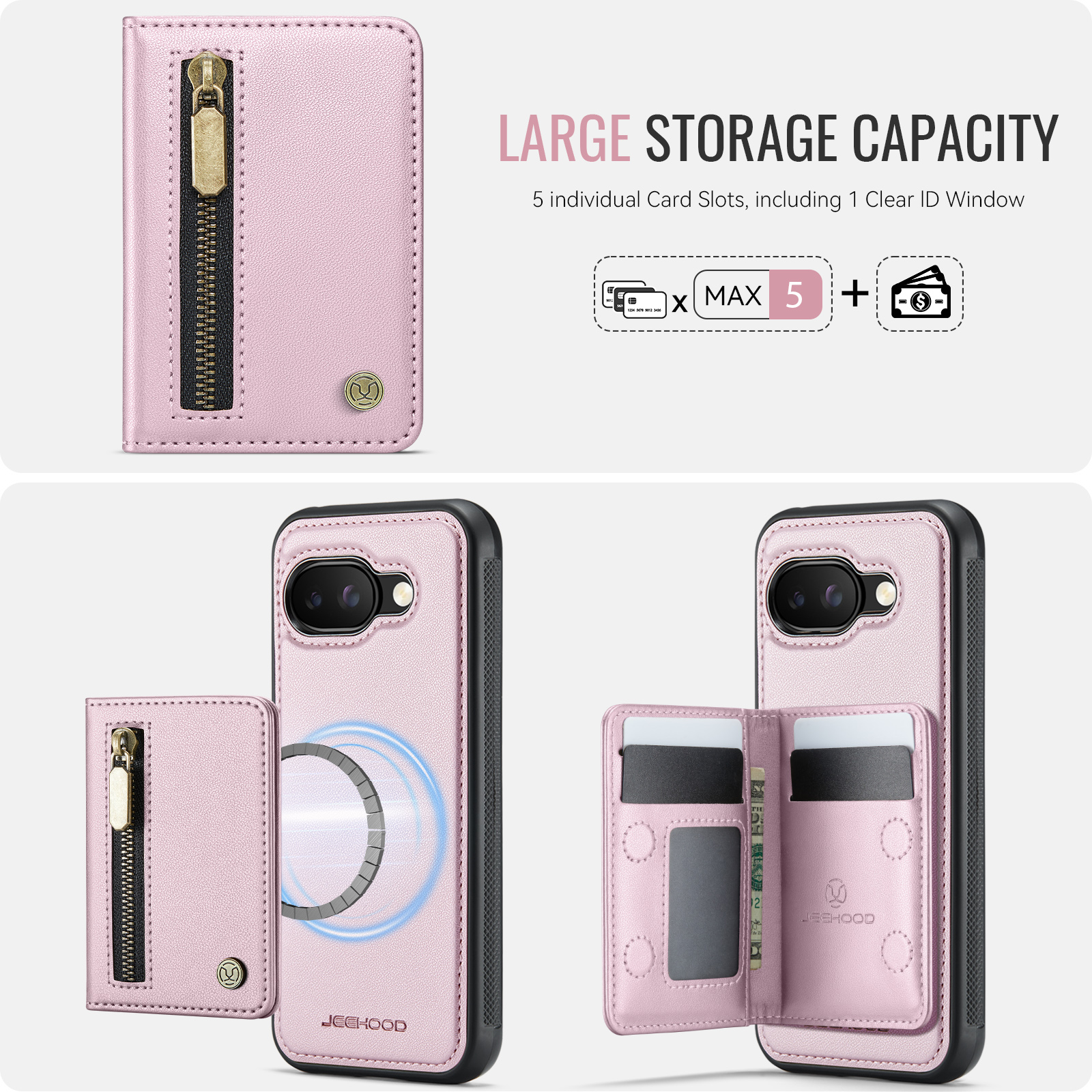 - Versatile Storage Features 1 zipper pocket on the front, 1 photo slot, 3 card slots, and a cash slot inside for maximum organization.