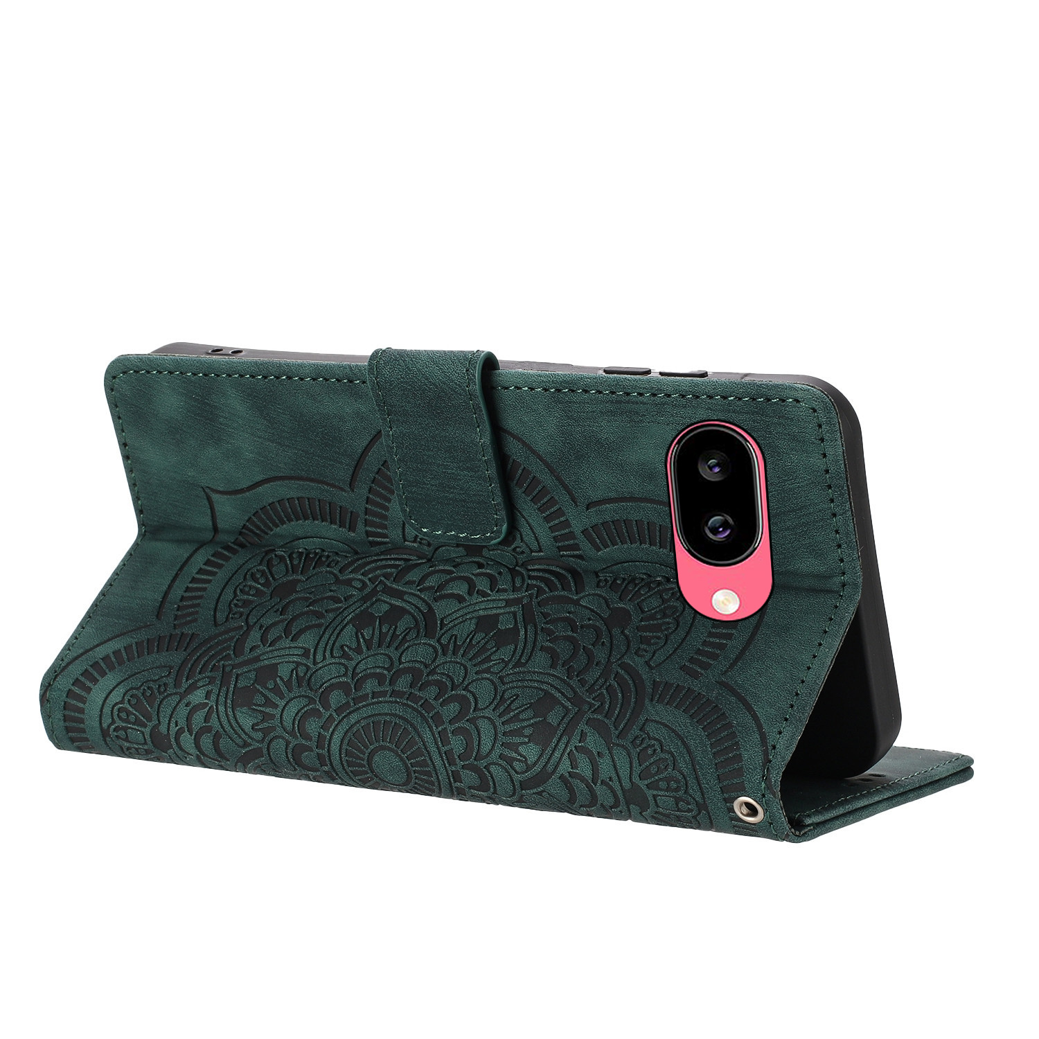 For Google Pixel 9a Case with 2Pcs Tempered Glass WANLONFENG MTL Series Mandala Leather Phone Cover - Midnight Green