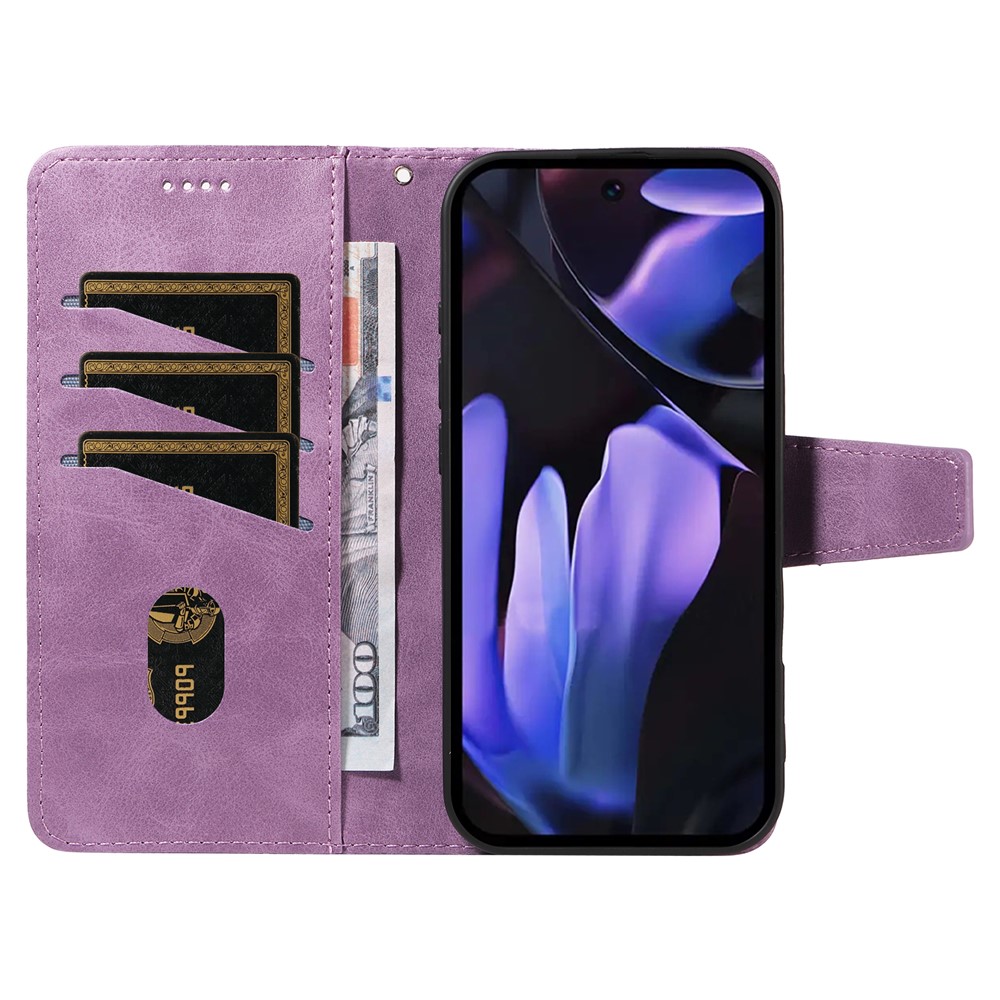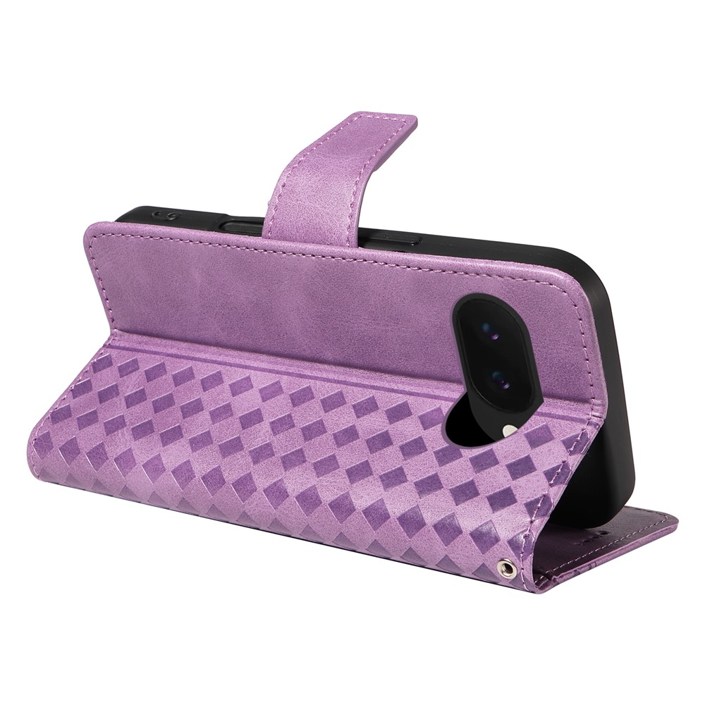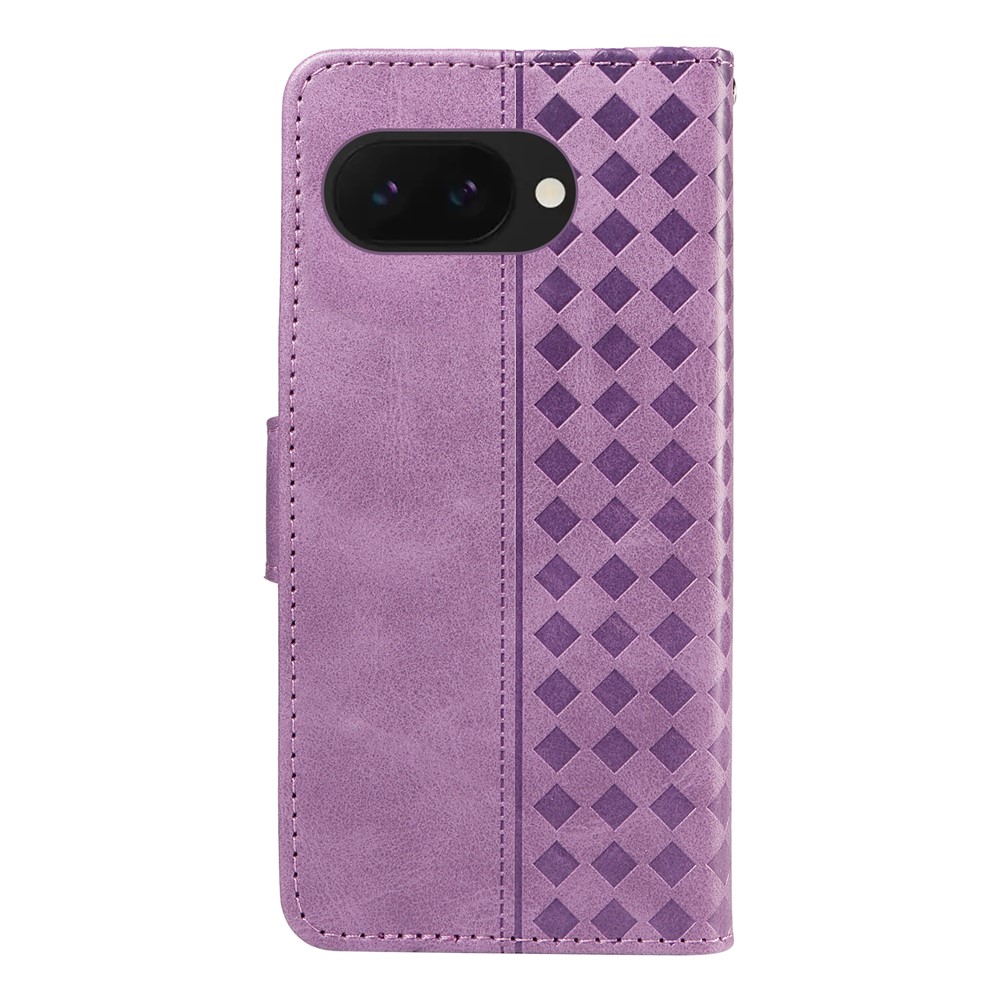 For Google Pixel 9a Leather Case Wallet Stand Grids Imprinted Phone Cover with Strap – Light Purple
