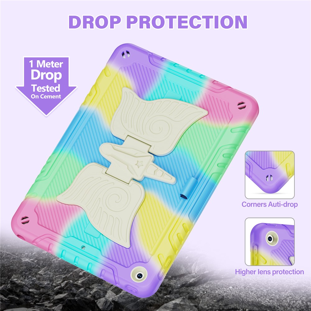 For iPad 10.2 (2021) / 10.2 (2019) / 10.2 (2020) Case Silicone+PC Drop-resistant Tablet Cover with Unicorn Kickstand – Colorful+Purple
