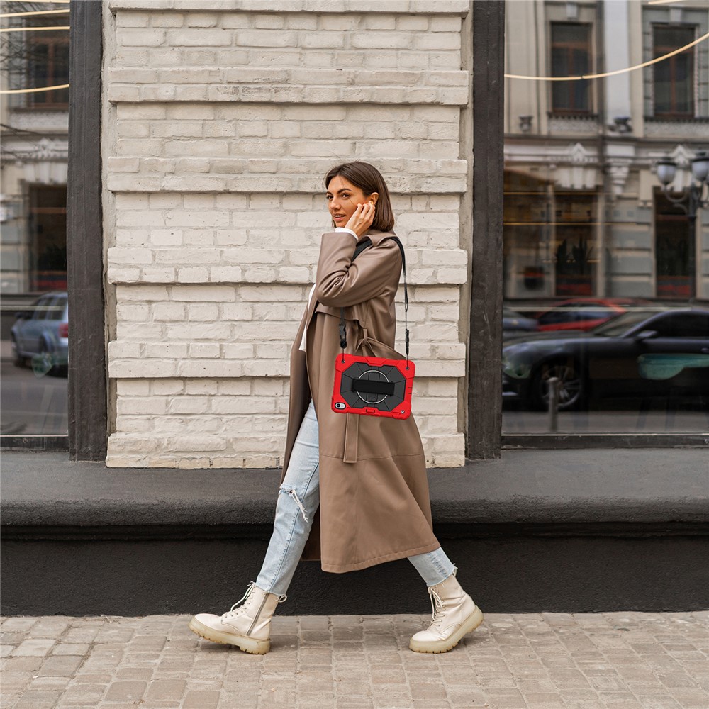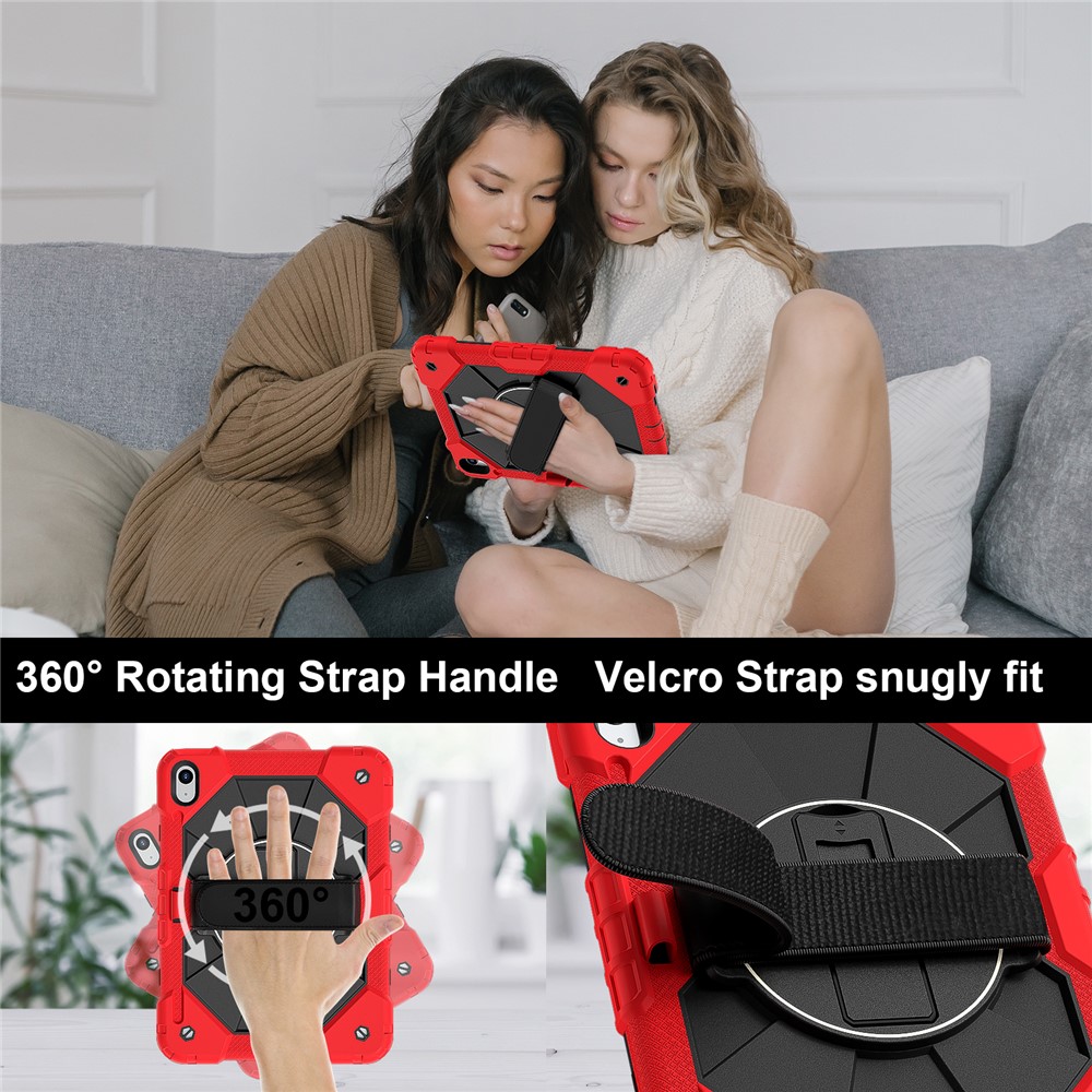 - Folding Kickstand & Hand Strap Features an integrated folding kickstand, allowing hands-free viewing; There is a handy strap on the back of the case, supporting 360-degree rotating, and you can hold your tablet in one hand