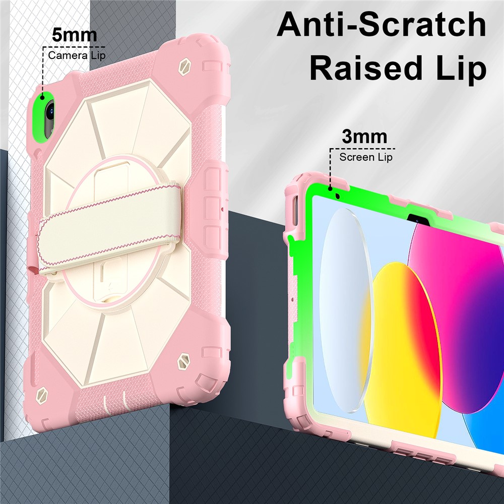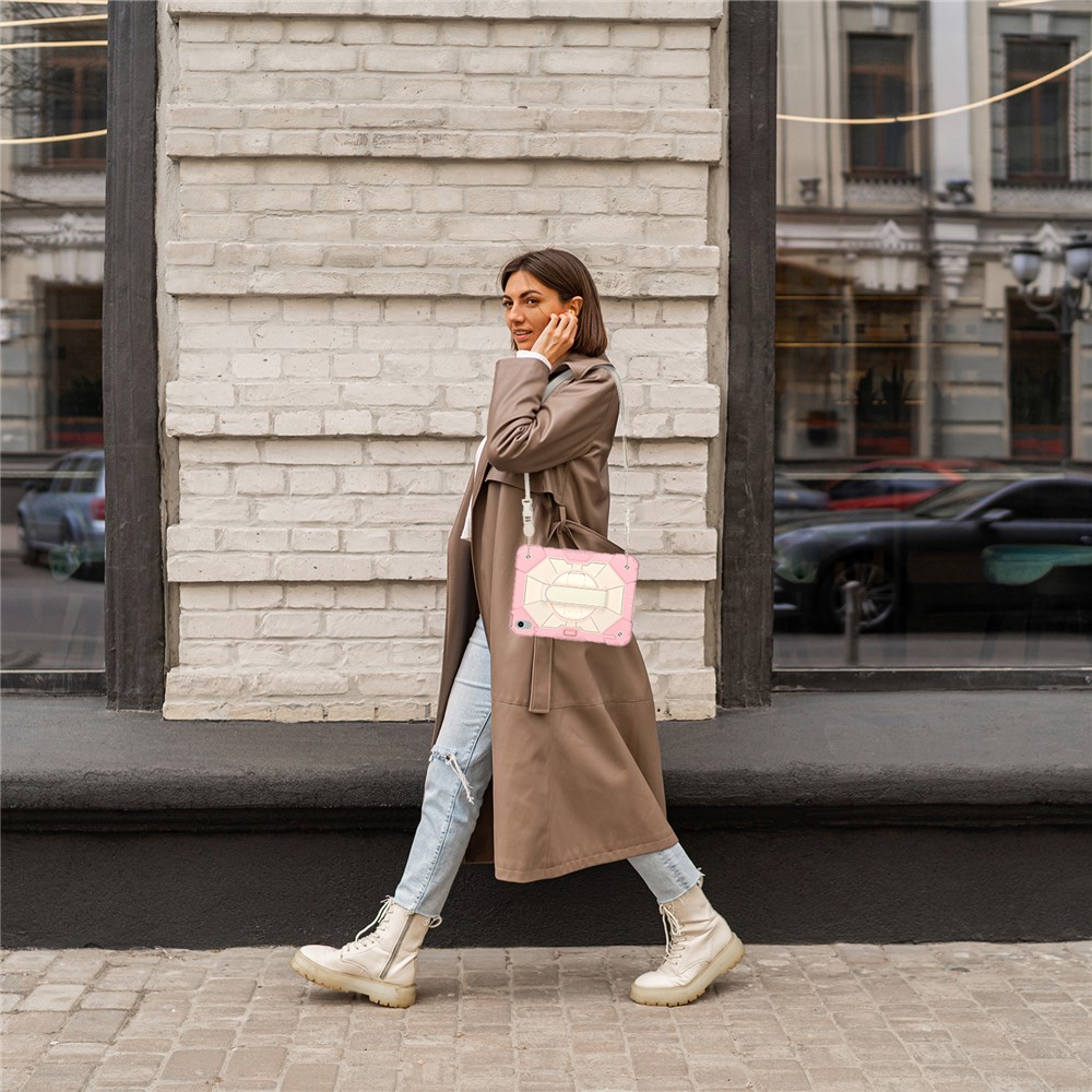 - Folding Kickstand & Hand Strap Features an integrated folding kickstand, allowing hands-free viewing; There is a handy strap on the back of the case, supporting 360-degree rotating, and you can hold your tablet in one hand