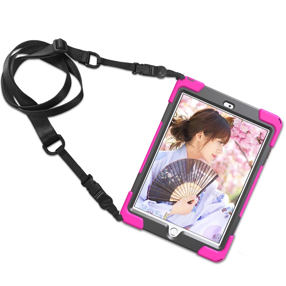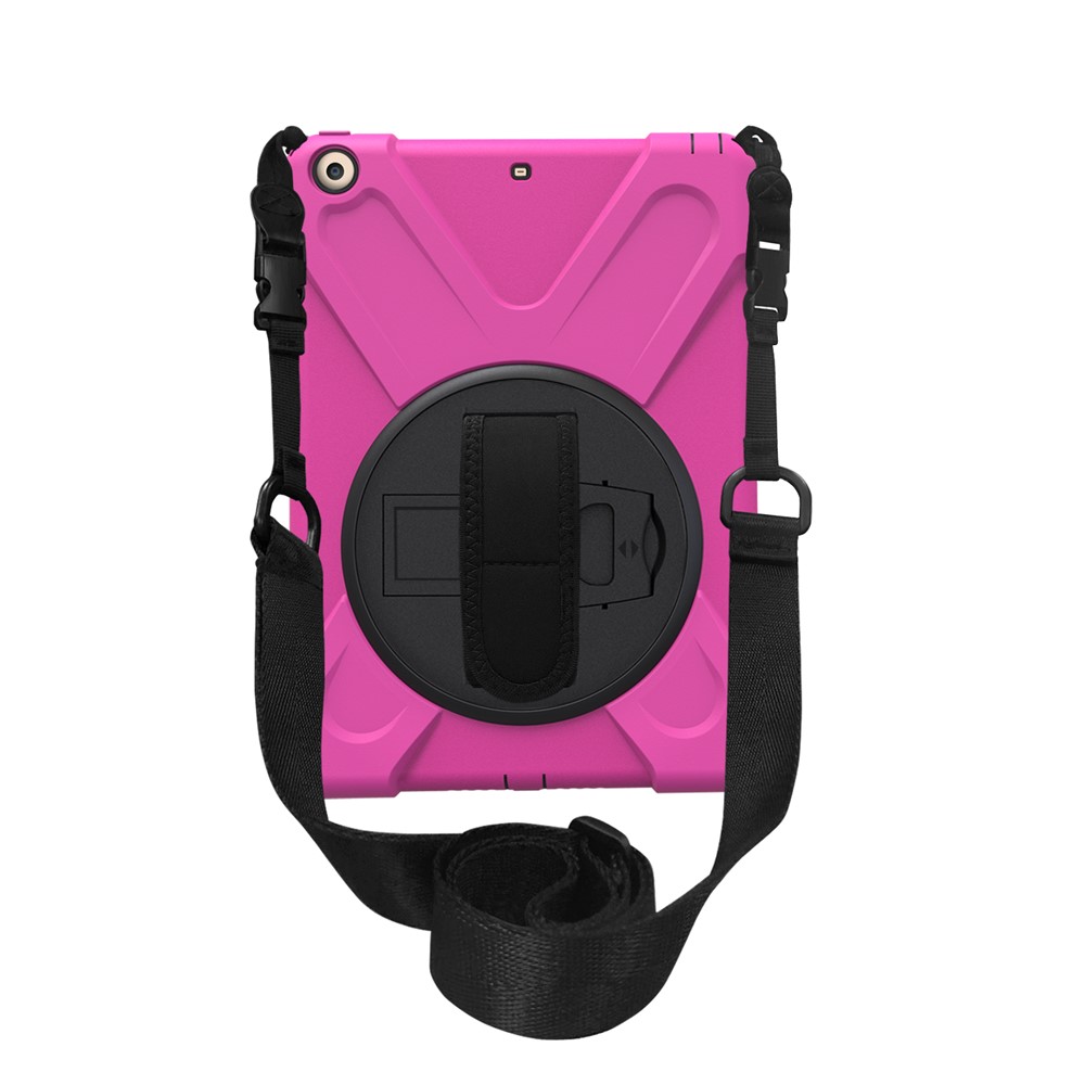 For iPad 9.7 (2018) / 9.7 (2017) X-Shape 360 Degree Swivel PC + TPU Combo Kickstand Protective Casing with Shoulder Strap – Rose