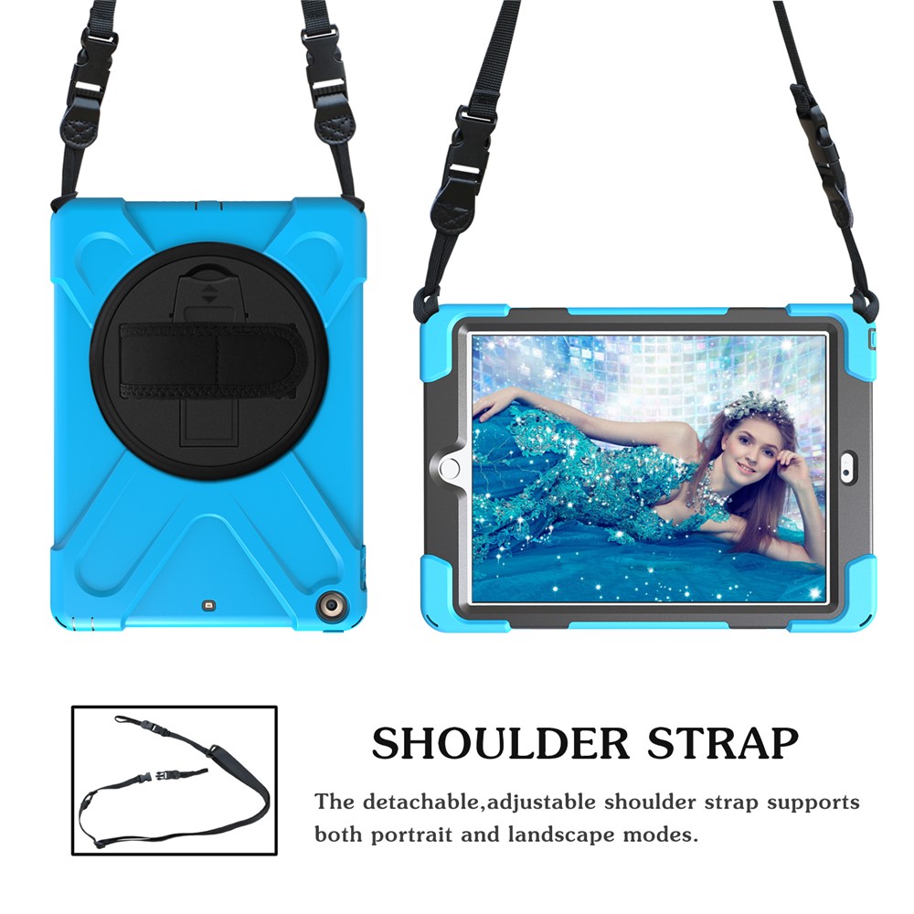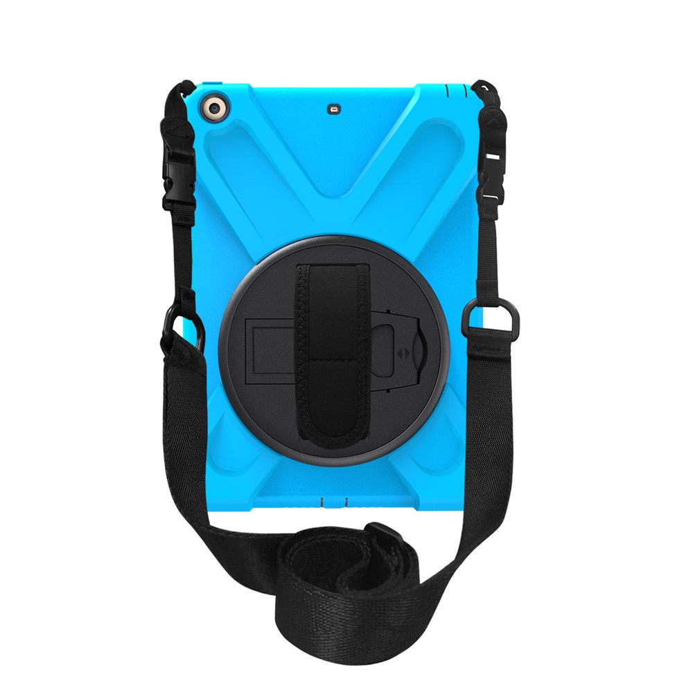 For iPad 9.7 (2018) / 9.7 (2017) X-Shape 360 Degree Swivel Plastic + TPU Hybrid Kickstand Case with Shoulder Strap – Baby Blue