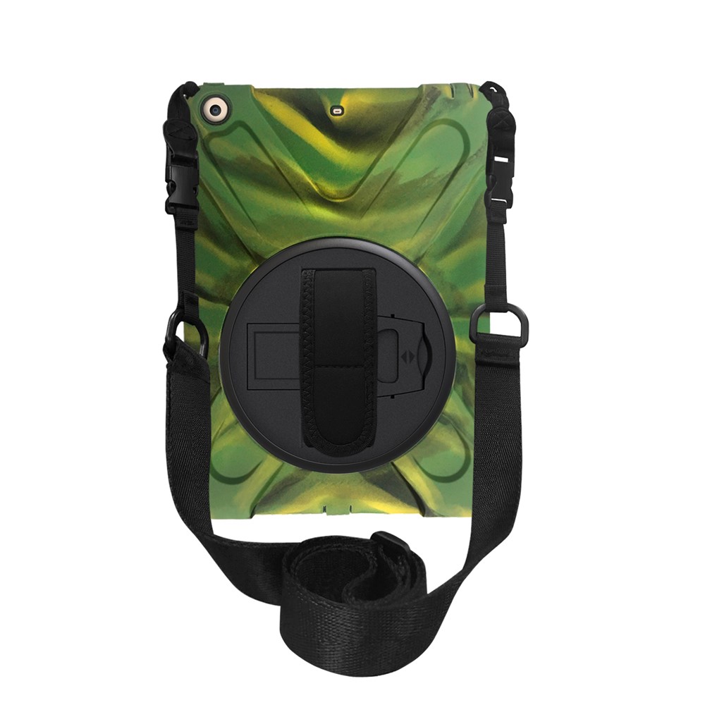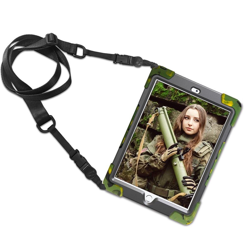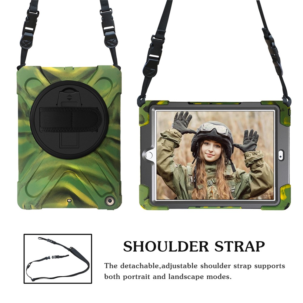 For iPad 9.7 (2018) / 9.7 (2017) X-Shape Anti-drop 360 Degree Swivel PC + TPU Combo Kickstand Casing with Shoulder Strap – Camouflage