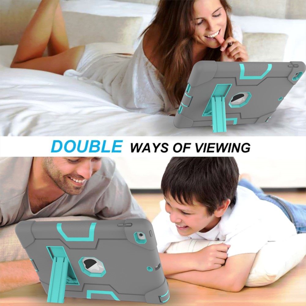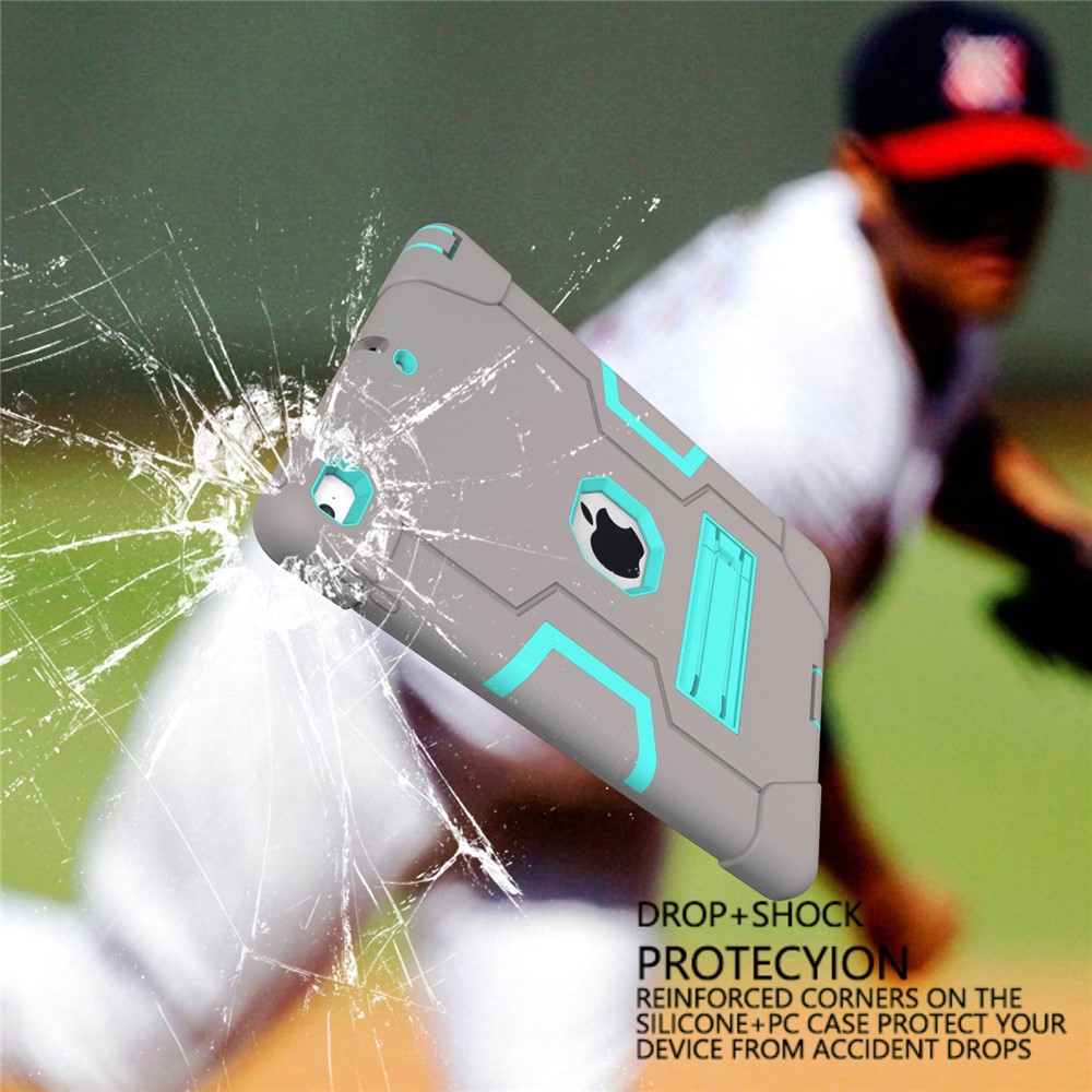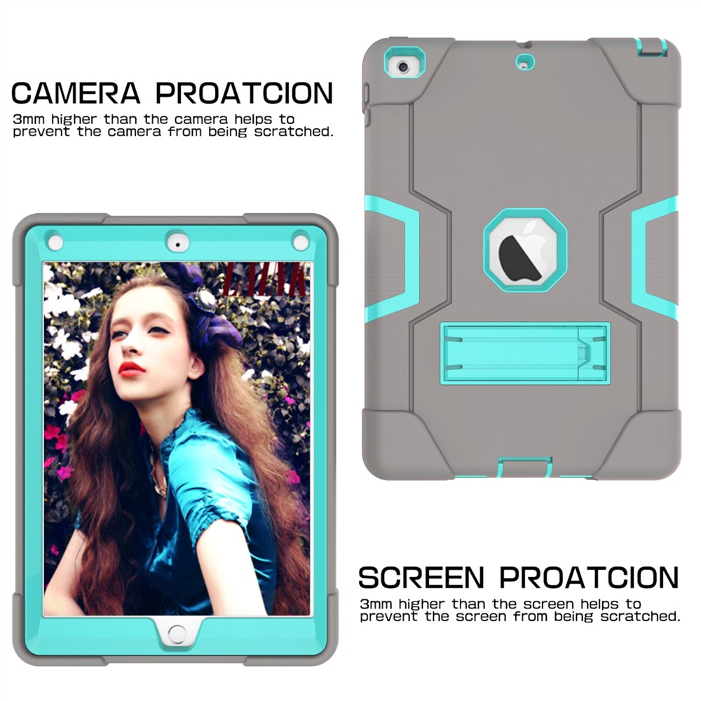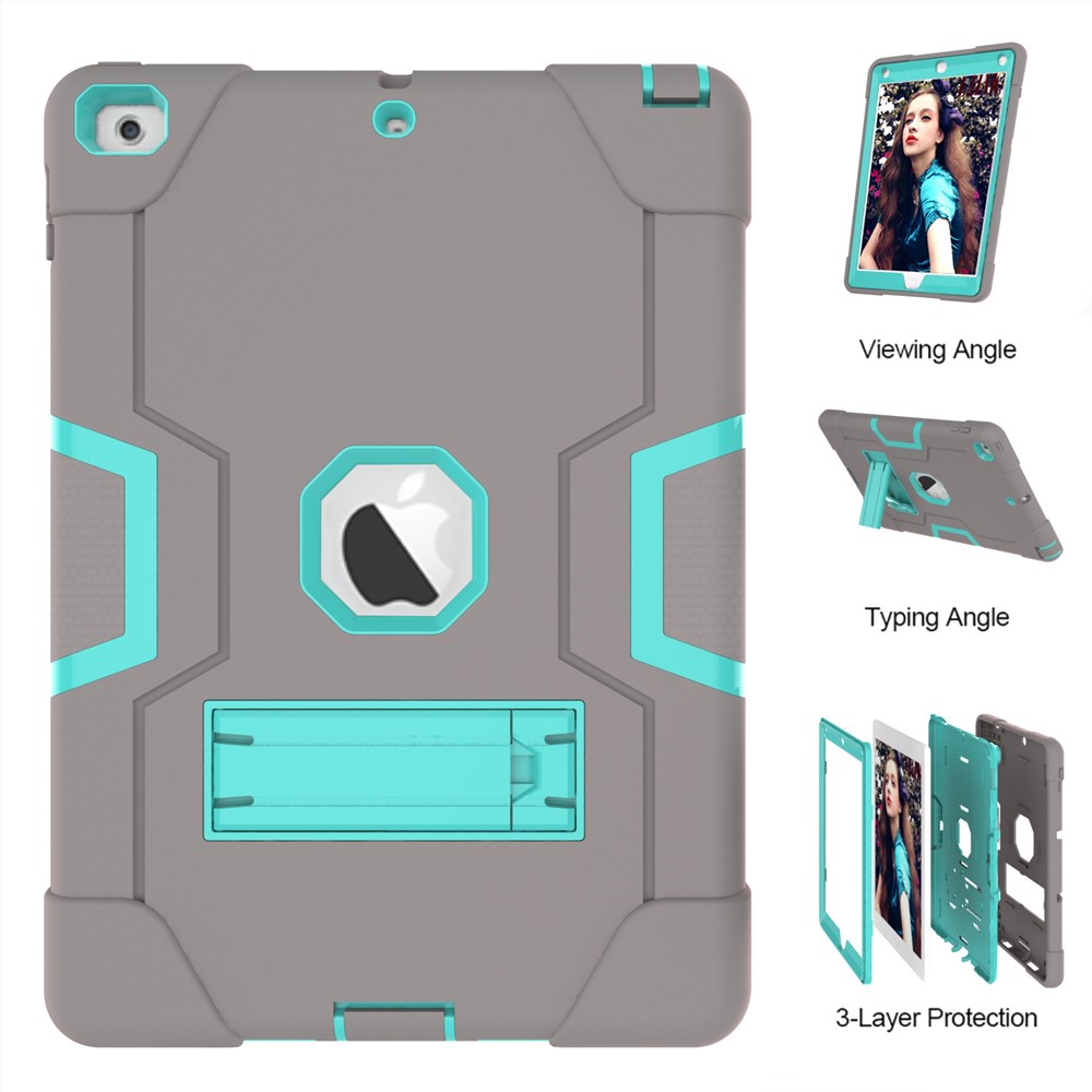 For iPad 9.7-inch (2018)/iPad 9.7-inch (2017) Bi-color PC Silicone Tablet Case Kickstand Anti-drop Hybrid Cover - Grey / Cyan $26.68