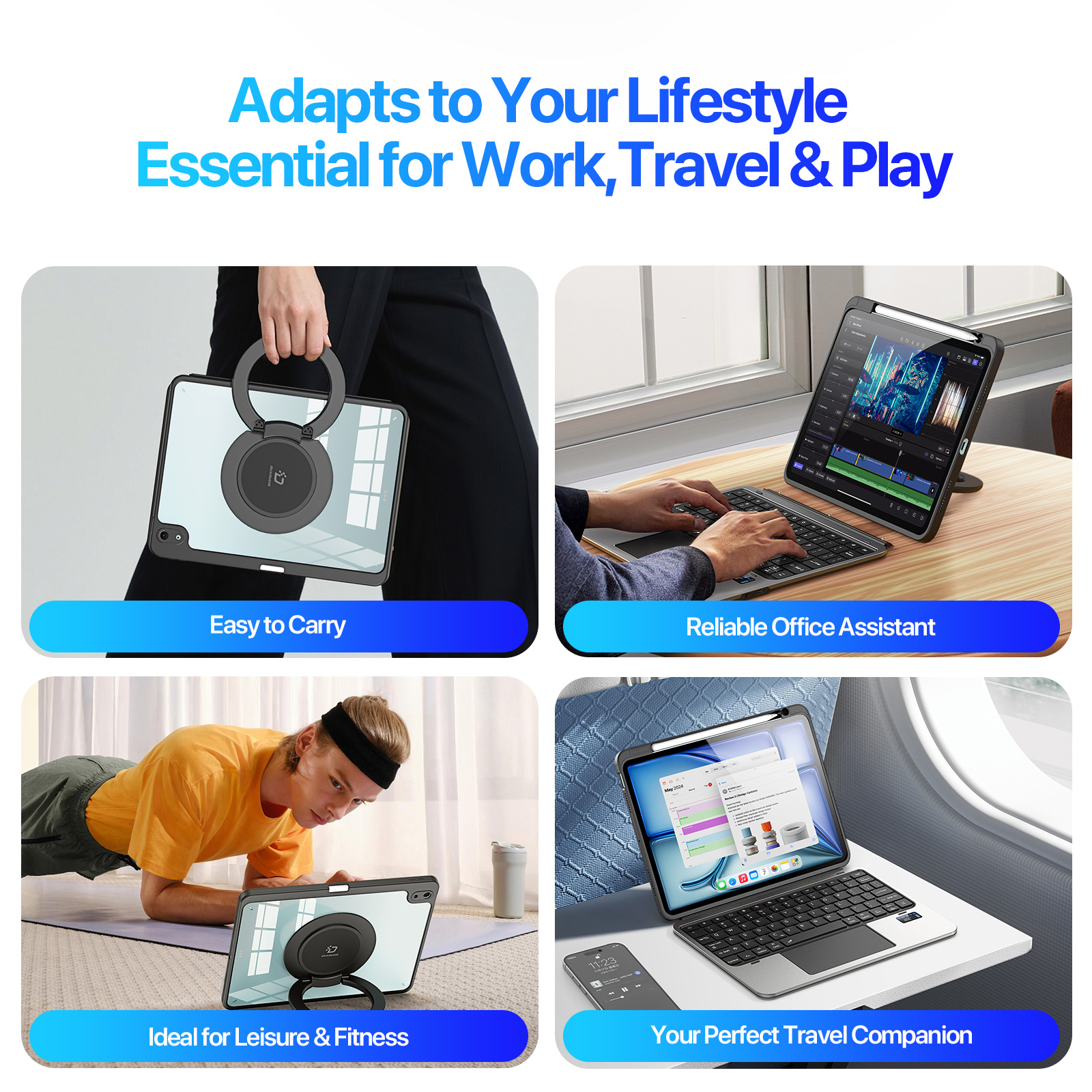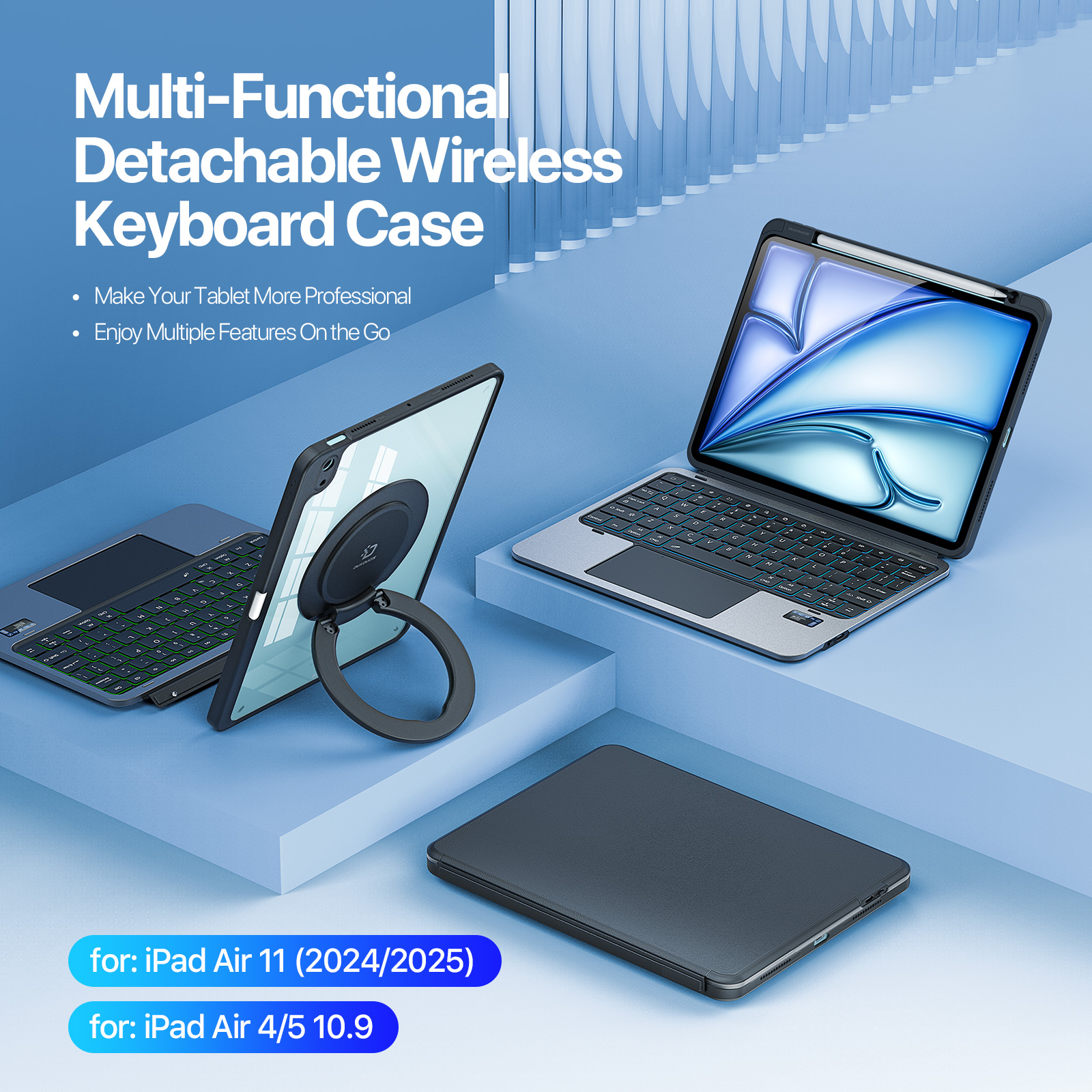 - Multi-functional Design Integrates keyboard, stand, and protective case, easily switching between work and entertainment modes with a single open-close action.